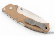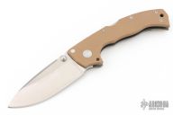 This Custom 4MAX by Andrew Demko features a satin finished drop point blade with dual thumbstuds and a notched thumbrest. The handle has coyote brown G-10 scales over a bead blasted titanium frame and a titanium tip up clip. Nice lockup and blade seating. Excellent condition.