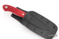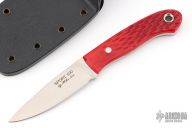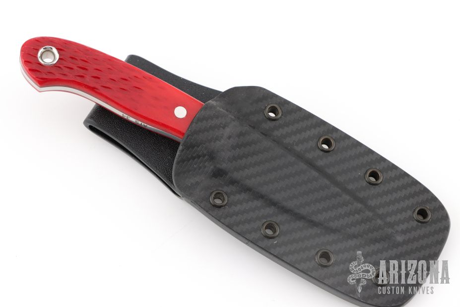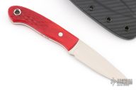 The Sport 100 by Mike Irie features a drop point style hand rub satin finished blade with a notched thumbrest and a full tang construction. 0.124" Blade Stock and .826" Blade Depth. The handle has red jig bone scales and a lanyard hole in pommel. Comes with kydex belt sheath. Has some patina, and light scratches, great condition otherwise.