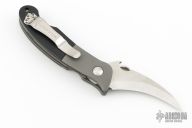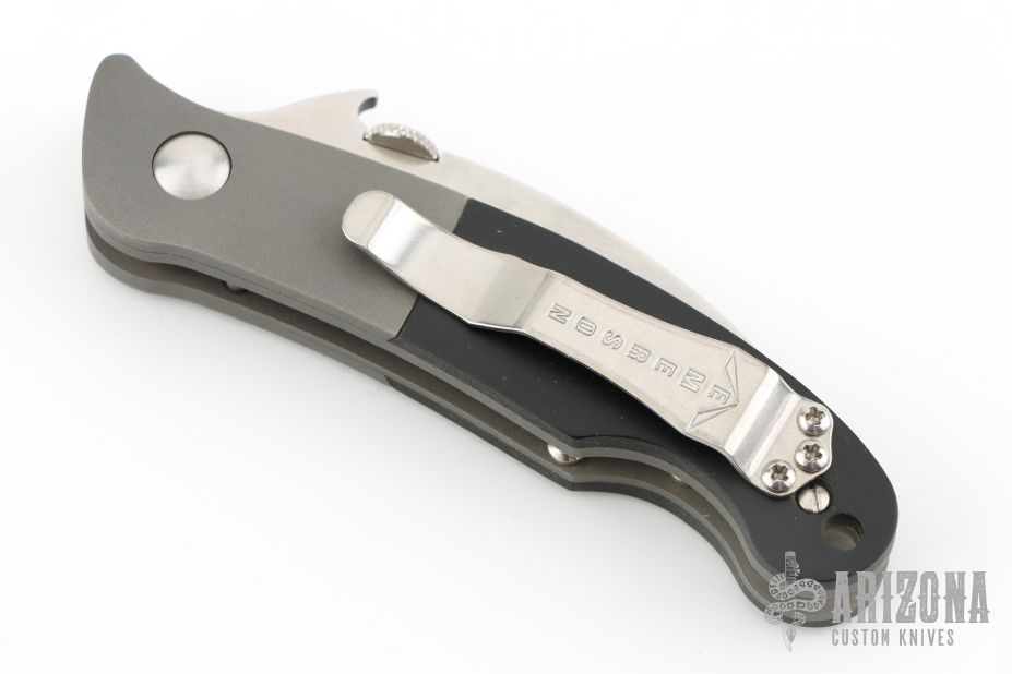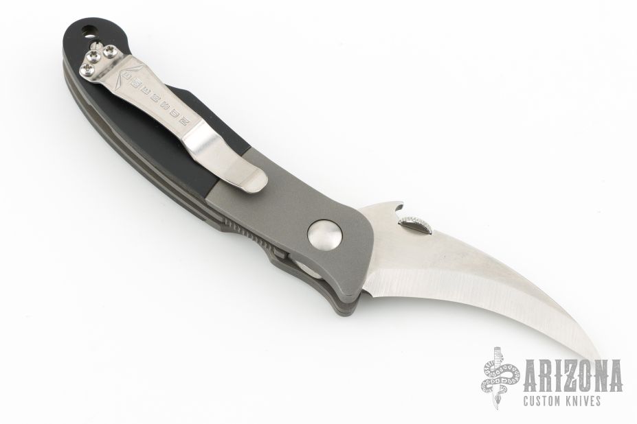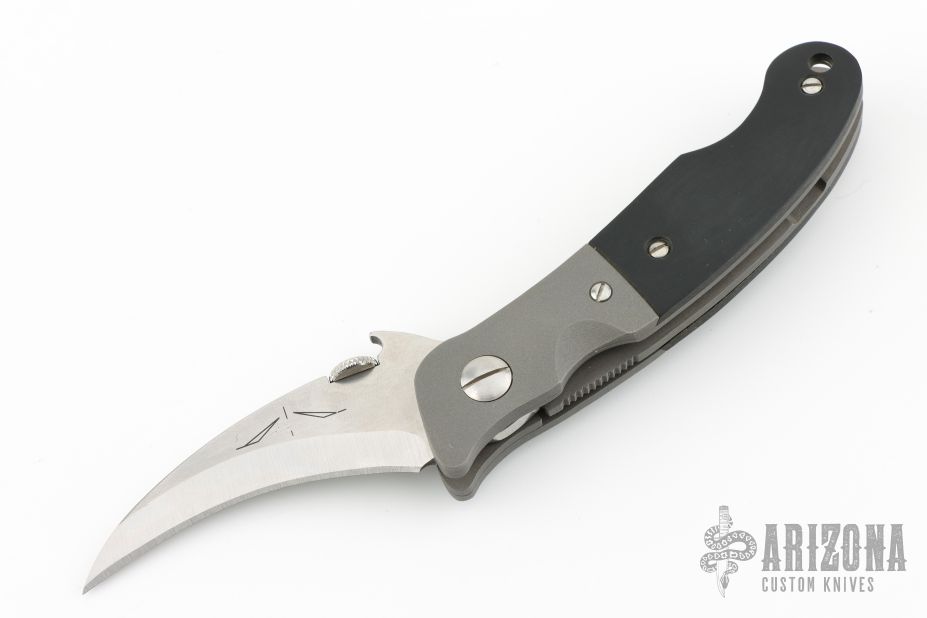 This Custom Elvia by Emerson Knives features a satin finished hawkbill blade with thumbdisc. The handle has bead blasted and dovetailed titanium bolsters, black paper micarta scales, bead blasted titanium liners and a stainless steel tip up clip. Comes with original box. Has a couple light scuffs, otherwise excellent condition.
