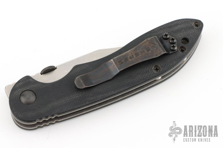 This Emerson Wild Horse linerlock folder has a stonewash finished blade with swedge, thumb disc, notched thumbrest. The handle has black canvas micarta scales over titanium liners, stainless steel clip. Signed by Ernest Emerson on the blade. #0047. Includes the original box and papers. Excellent Condition.