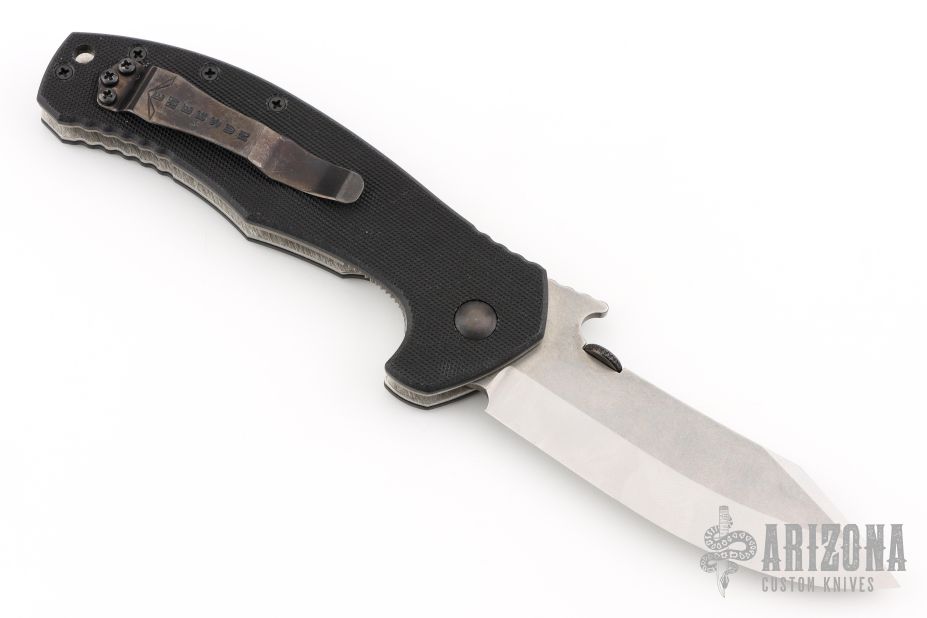 This Combat Systems Fighter by Emerson Knives features a satin finished blade with notched thumbrest, thumbdisc and wave feature. The handle has titanium liners, black G-10 scales, black posts, black stainless steel clip, tip up carry. Includes original box and papers. #0309. Excellent condition.