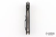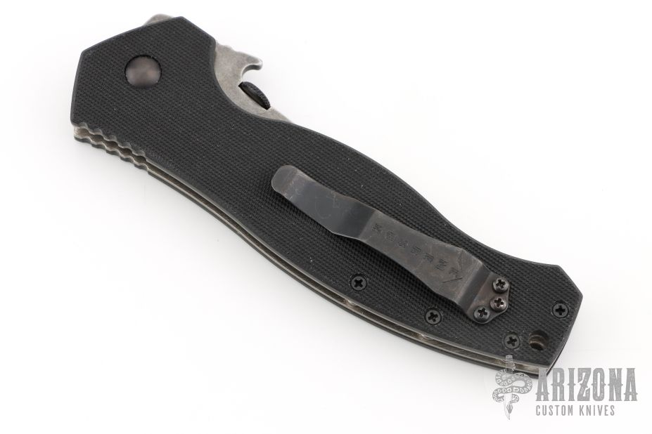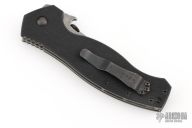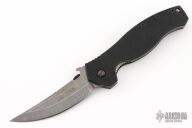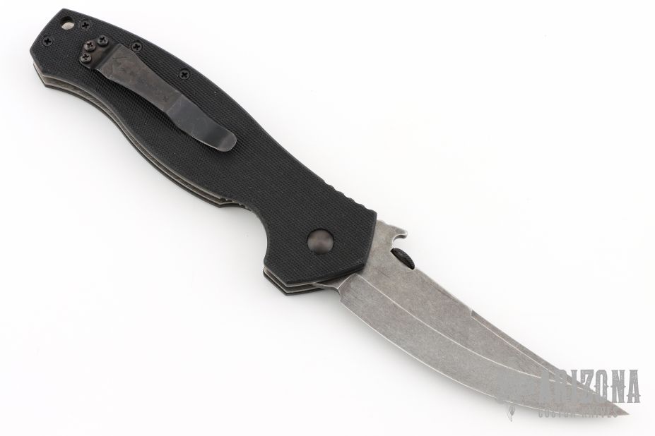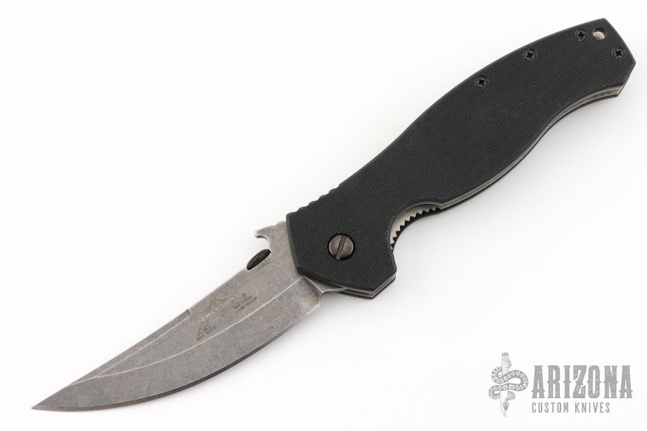 This Hattin from Emerson Knives features a Thunderstorm finished upswept blade with thumb disc and wave features. The handle has black G-10 scales over stonewashed titanium liners, stainless steel tip up clip. Lanyard hole in pommel. Excellent condition. Comes with original box and papers. #0112