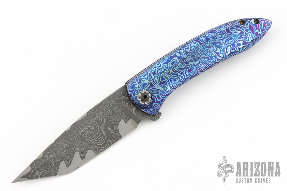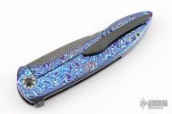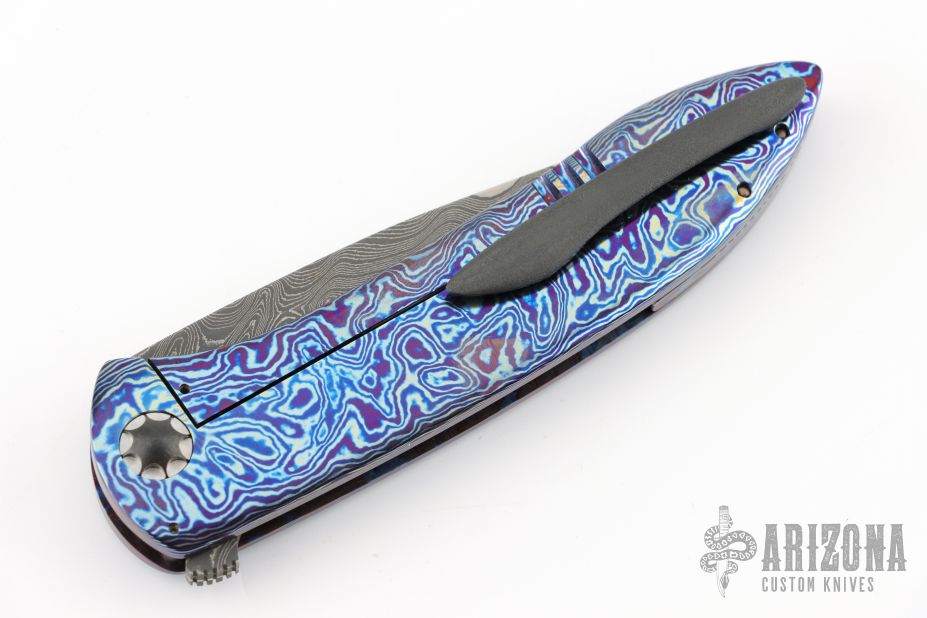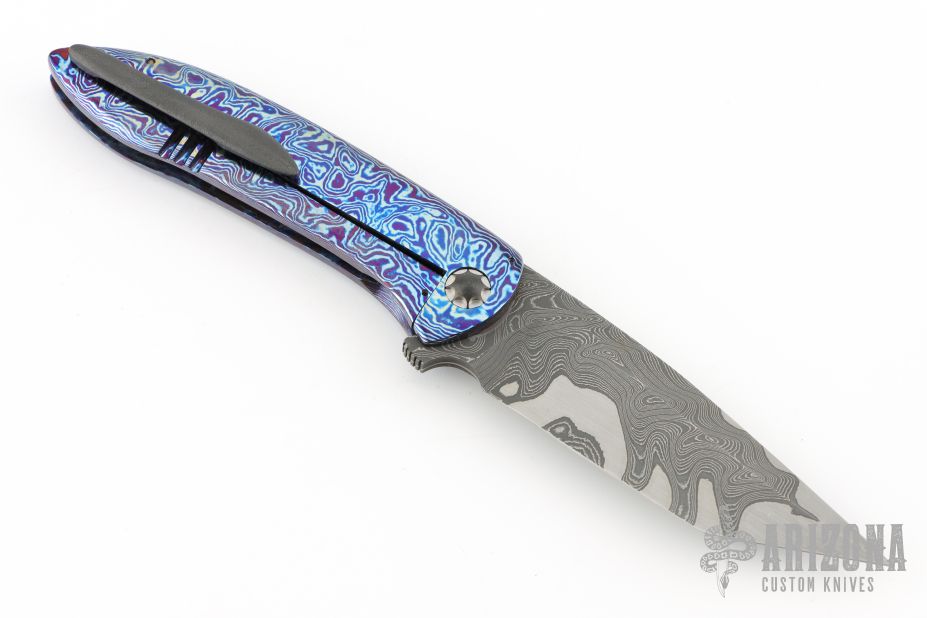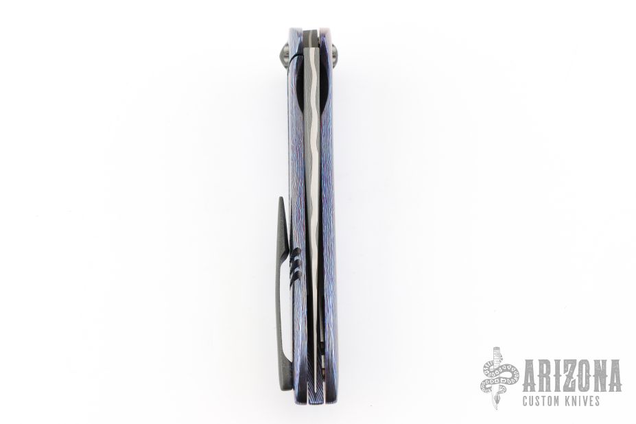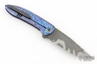 This Lycan flipper from Jonas Iglesias features an Armor Core San Mai Damascus blade with notched flipper. The handle has a full timascus frame, zirconium pivot and tip up clip with hidden screws, floating timascus backspacer. Rides on ceramic bearings, nice detent, lockup and blade seating. Excellent condition. Comes with a zippered case and COA dated 4/3/19.