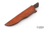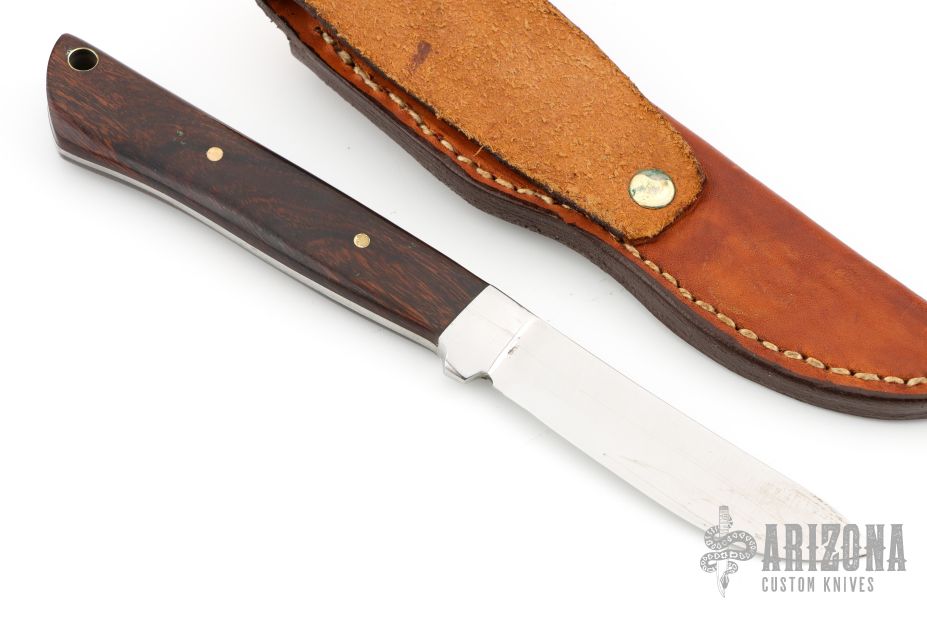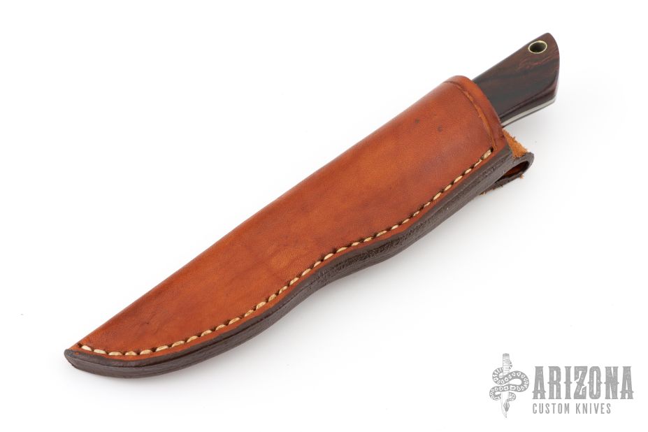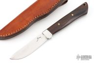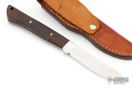 This fixed blade by Larry Porgreba features a satin finished blade with integral dovetail bolsters. The handle is comprised of desert ironwood scales over full tapered tang with lanyard hole in pommel. Comes with leather belt sheath. Has some scuffs and scratches, great condition otherwise.