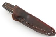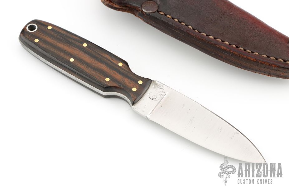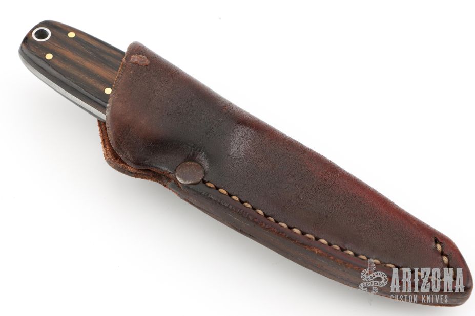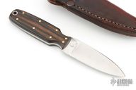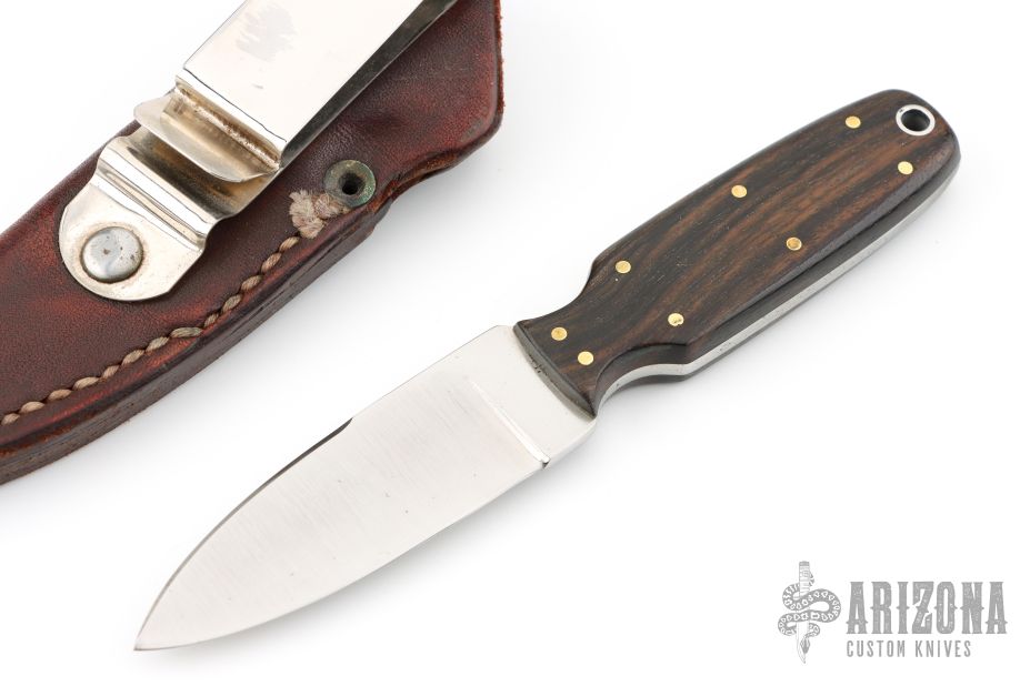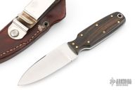 This knife by Sean McWilliams features a satin finished drop point blade, hollow ground, false top edge, .118" blade stock and .948" blade depth, full tang construction. The handle has wood covers, brass pins, and a lanyard hole. Comes with a leather sheath with metal clip. Has some light scratches, otherwise excellent condition.