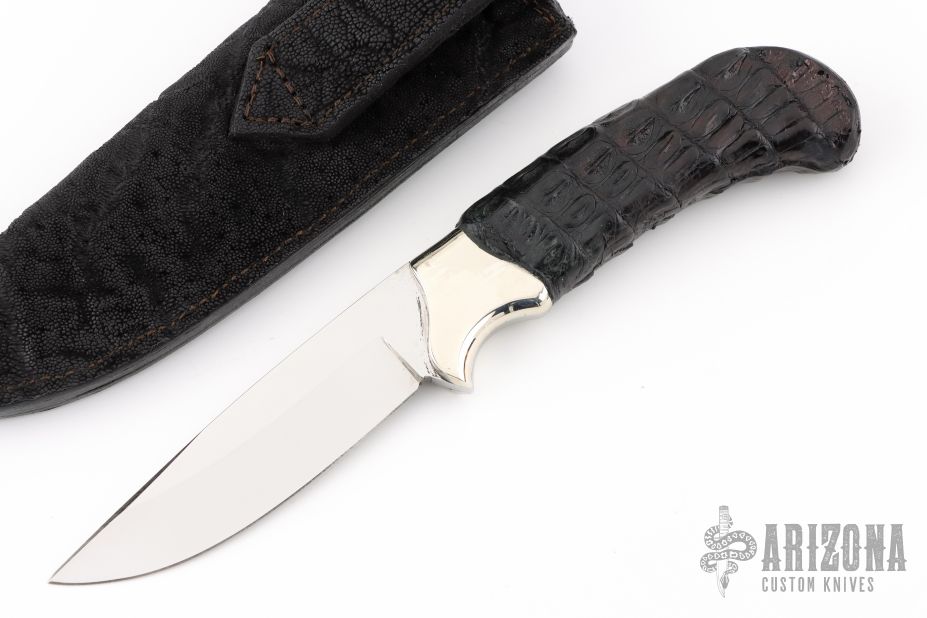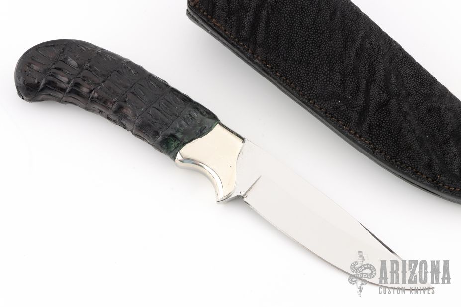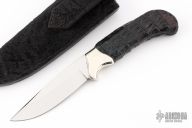 This knife by Jim Ort features a mirror polish finished drop point blade with .157" blade stock and .993" blade depth, hidden tang construction. The handle has nickel silver bolsters, and leather grip. Comes with a leather belt sheath. Has some light scratches, otherwise Excellent condition.