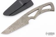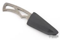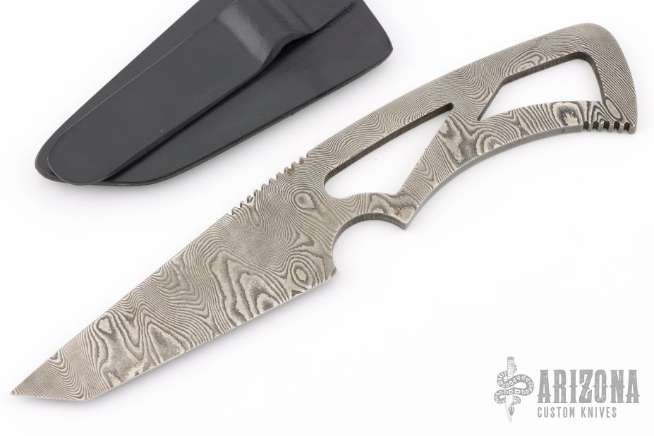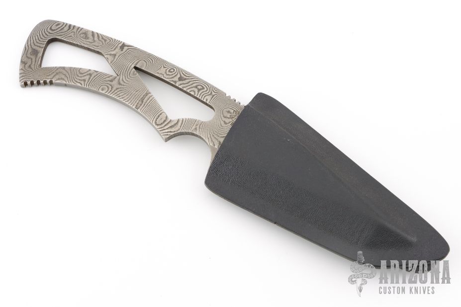 ThisDamascus Chisel Grind Tanto fixed blade by Jim Ferguson features a notched thumb rest, swedge, .175" blade stock, .1548" blade depth, and full tang construction. The handle has been skeletonized for weight reduction. Comes with a kydex sheath. Has some light scratches and patina. Excellent condition otherwise.