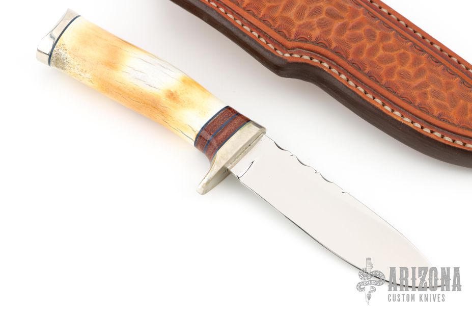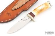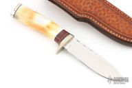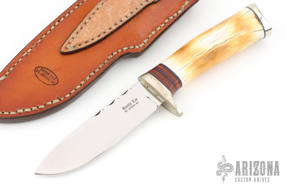 This knife by Randy Lee features a mirror polish blade with file-worked blade spine, .121" blade stock and .992" blade depth, hidden tang construction. The handle has a nickel silver guard and butt, bone grip with leather/black spacers. Includes a hand tooled brown leather sheath with belt loop. Has some light scratches, and patina. Great condition otherwise.