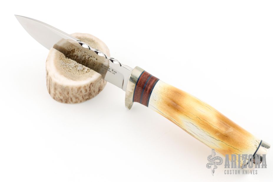 Randy’s fascination with knives began as a young man when he made his first knife in a high school “metals” class. He collected them for years and eventually began making his own to get a better edge-holding skinner for hunting. Randy read books and visited local makers to learn the craft. In 1979, he decided to invest in shop equipment so that he could properly master his knife making skills. In a few years, he was making and selling knives to local hunters, while continually developing his style and craftsmanship. He attended his first knife show in 1986 and has been participating in about six shows each year since then. As an avid hunter, Randy knows how a good hunting knife should perform. He loves to “field-test” his designs and feels that a quality knife should not only look great, but perform well as a tool. He offers a wide variety of knife styles; from utility hunters and fighters to collector pieces such as daggers and bowies. Although the actual work of grinding and buffing knives is very tedious, he always finds it rewarding to see the final finished product. Randy particularly enjoys meeting people who find knives as interesting and exciting as he does. Randy’s wife, Sonja Lee, is one of the premier sheath makers in the business. Using exotic hides, or leather and various forms of tooling, she has mastered the craft of sheath making. Sonja creates the custom sheaths which are provided for each of Randy Lee’s knives and she is now making custom sheaths for many other knife makers and collectors.
