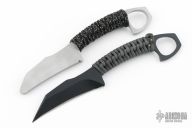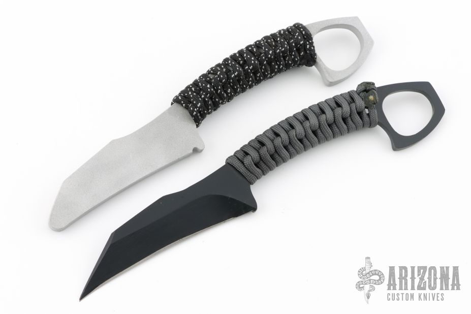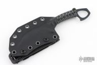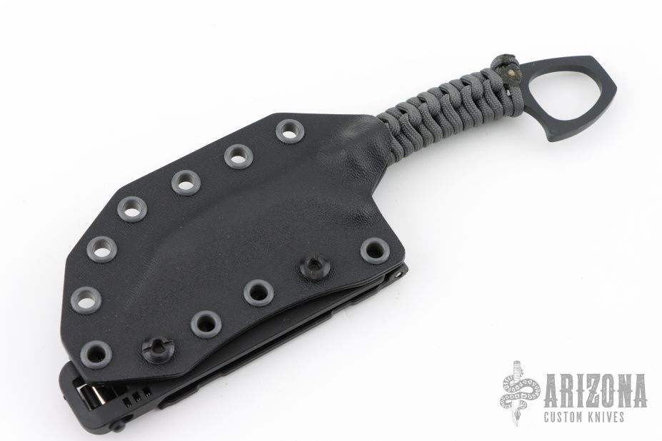 SHPOS "Sub Human Piece Of Shit" elite cerakote finish, rock work spine, 7.75" overall, 3" blade, .12" thickness, s35vn American steel, rc60. Includes suede lined black kydex sheath with metal belt clip, belt clip can be positioned for either side of sheath. Blade designed by Special Operators for easy carry and easy access in plate carrier or in low vis situations, for pushing or stab and slash movements. Excellent condition. Comes with original box, papers, sheath and trainer.
