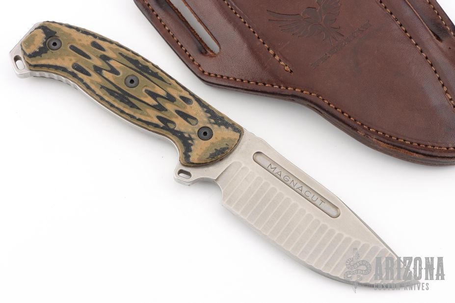 The CPM MagnaCut drop point blade features a machined fuller and primary flat grind with a secondary swedge or "false edge" for maximum toughness and piercing ability.