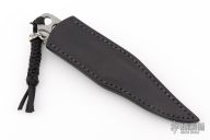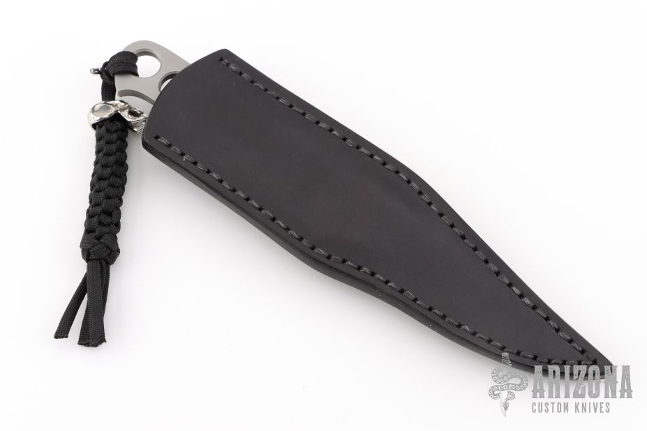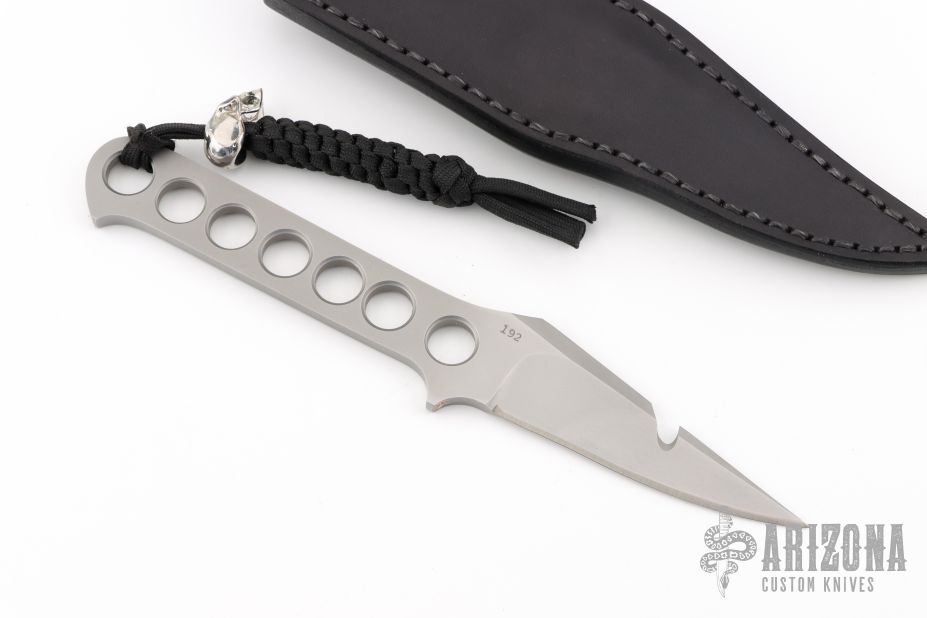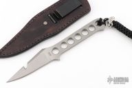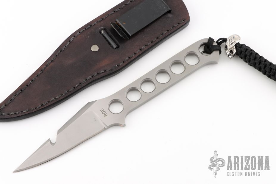 This knife by Mark Roe of Roe Custom Knives features a bead blast clip point blade with swede, cord cutter, .211" blade stock and 1.196" blade depth. The handle is integrally constructed and skeletonized. Comes with a leather sheath, and lanyard with bead attached. Has some scuffs and scratches, great condition otherwise.