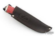 This Knife from Olamic Cutlery features a Damascus blade with .163" blade stock and 1.293" blade depth, hidden tang construction. The handle has a brass collar, wood grip and nickel silver butt cap. Comes with original leather sheath. Has some patina. Excellent condition.