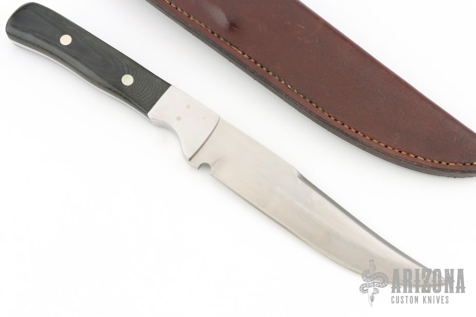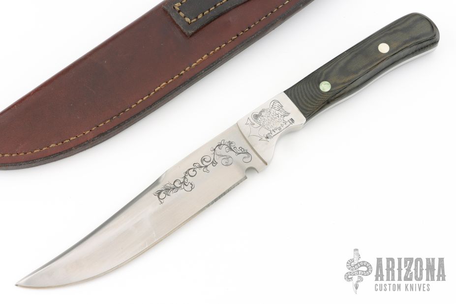 This knife by Ray Beers features a hand-rubbed satin finish blade with .164" blade stock, 1.213" blade depth, and full tang construction. The handle has dovetailed stainless steel bolsters, and a pinned, contoured micarta handle. Engraving work on one side of blade and on one bolster. Comes with a leather belt sheath. Has some scratches, excellent condition otherwise.
