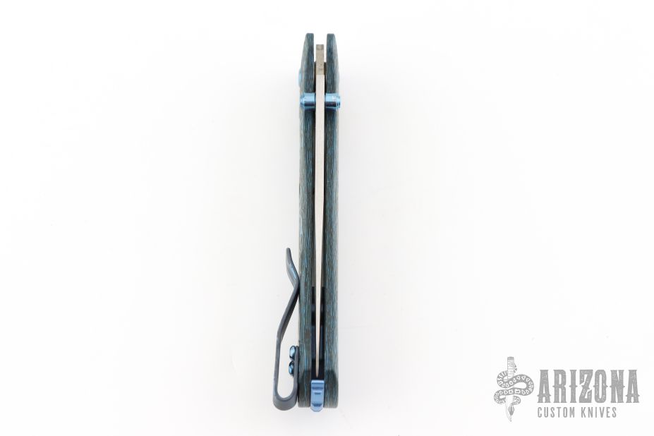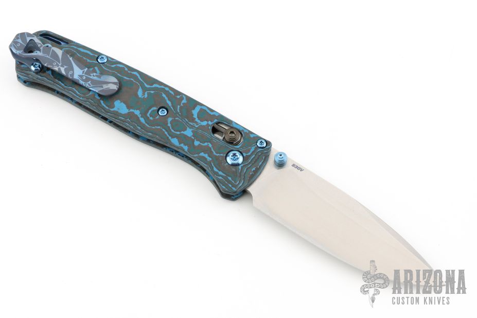 The Bugout features a drop point blade with a stonewash finish. It's a manual opener with ambidextrous thumb studs. This AXIS lock has Flytanium Arctic Flow Carbon Fiber scales, anodized titanium backspacer and hardware, a limited edition Lynch NW deep-carry pocket clip, and a lanyard hole. Includes original box and papers. Excellent condition.