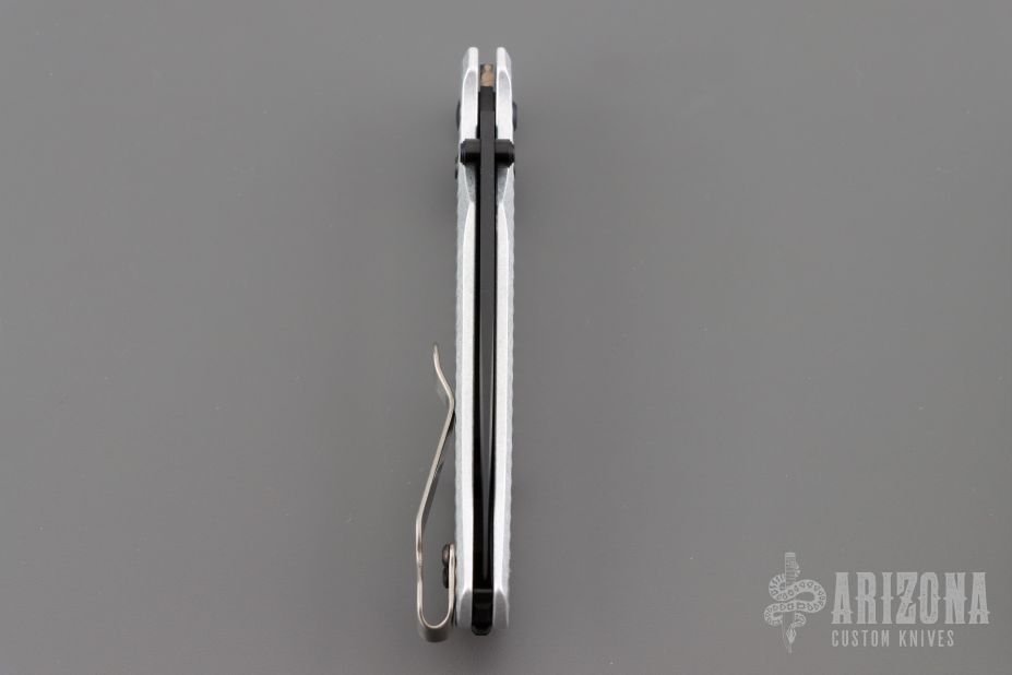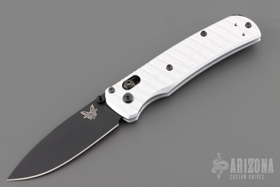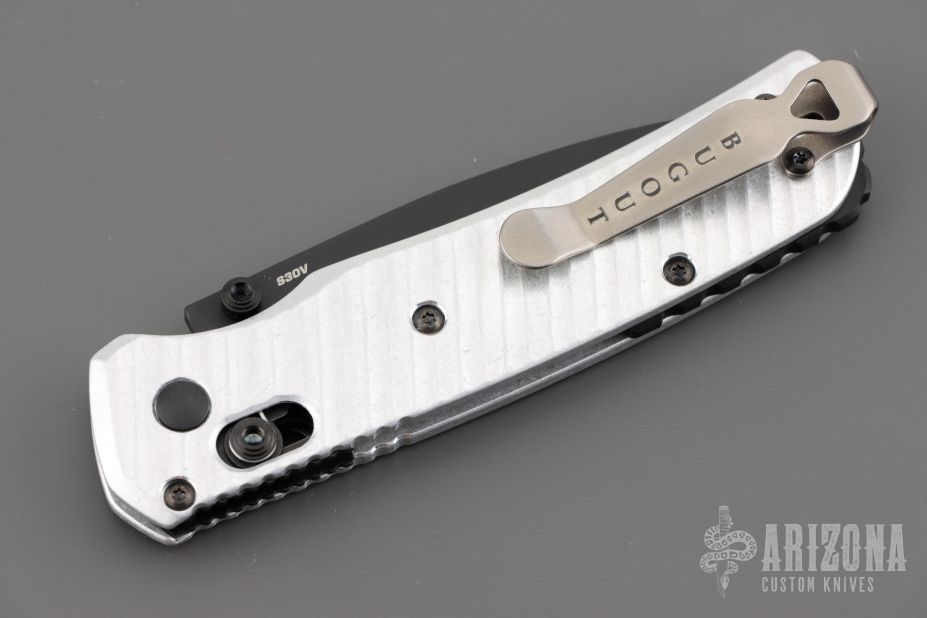 The Bugout features a drop point blade with a black finish. It's a manual opener with ambidextrous thumb studs. This AXIS lock has AWT Raw Aluminum scales, black titanium backspacer and hardware, a Lynch NW deep-carry pocket clip, and a lanyard hole.  Includes original box and papers. Excellent condition.