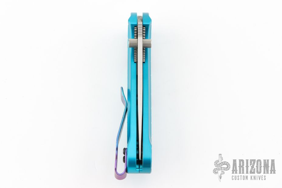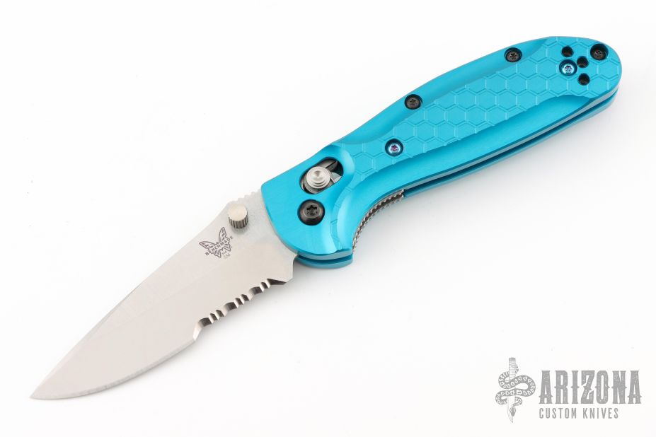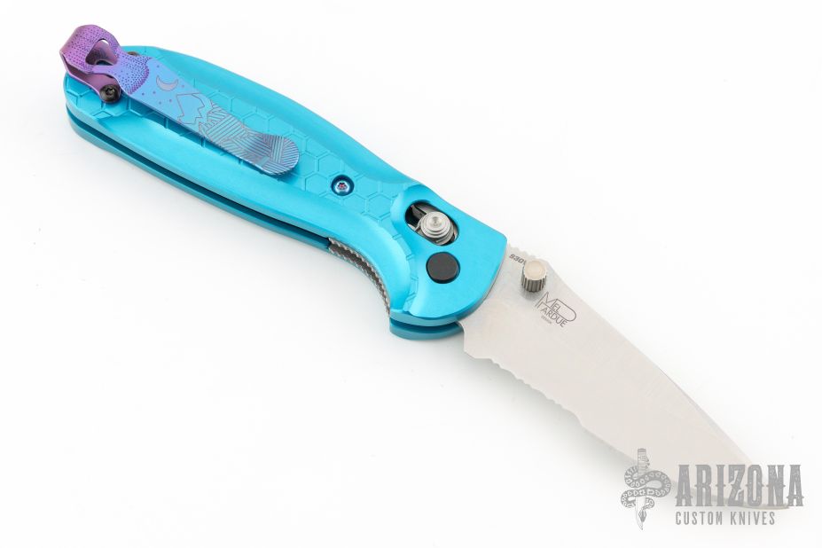 This 556S Mini Griptilian by Benchmade features a stonewashed drop point partially serrated blade with dual custom titanium thumb studs and notched thumbrest. The handle has custom anodized aluminum scales with anodized titanium screws from Monkey Edge, stainless steel sub frame, Lynch NW deep carry tip up clip is reversible for right or left hand carry. Excellent condition. Comes with original box and papers.