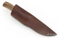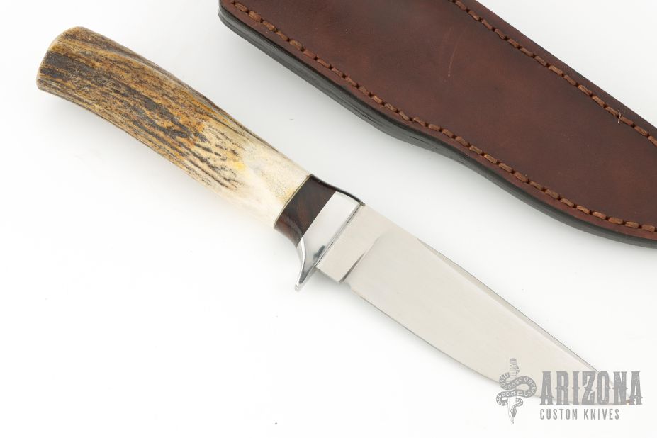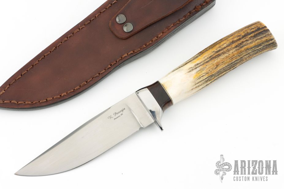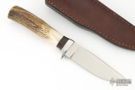 This hunter by Robert Panagia features a hand rub satin finished blade with false top edge, .192" blade stock and 1.247" blade depth, hidden tang construction. The handle has a stainless steel guard, and nice stag grip. Comes with a brown leather sheath. Has a few light scratches, otherwise excellent condition.
