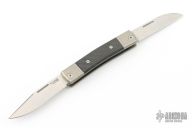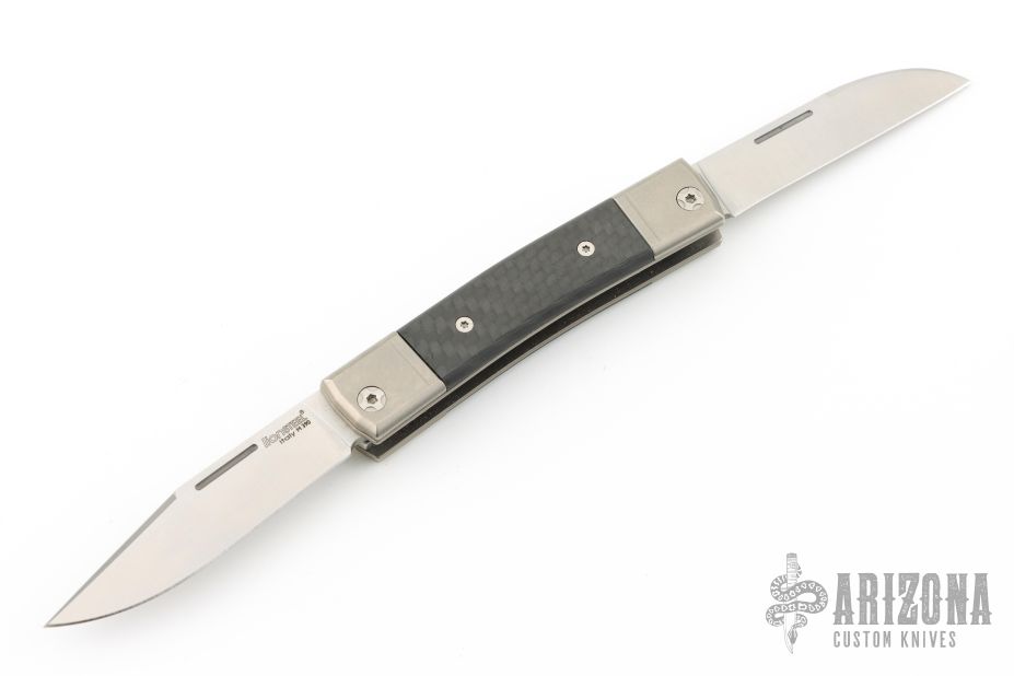 This model of the LionSteel BestMan has both a clip point and wharncliffe blade. The handle has carbon fiber inserts with titanium bolsters. The BestMan from LionSteel is a traditional slip joint folder with modern materials. It has titanium bolsters with titanium liners. The blades are made from Bohler M390 with a satin finish. A nail nick is located on both sides of the blades, making the knife truly ambidextrous. Features: Bohler M390 stainless steel blades for excellent edge retention and corrosion resistance. A solid half-stop that is smooth, yet easy to disengage. The stainless steel back bars and the spine of the blades have both been crowned for a classy and clean look. Excellent condition. Comes with original box and papers.