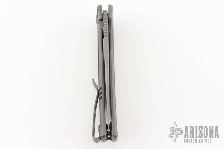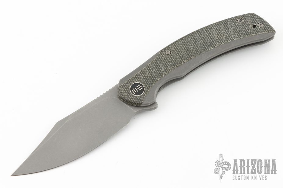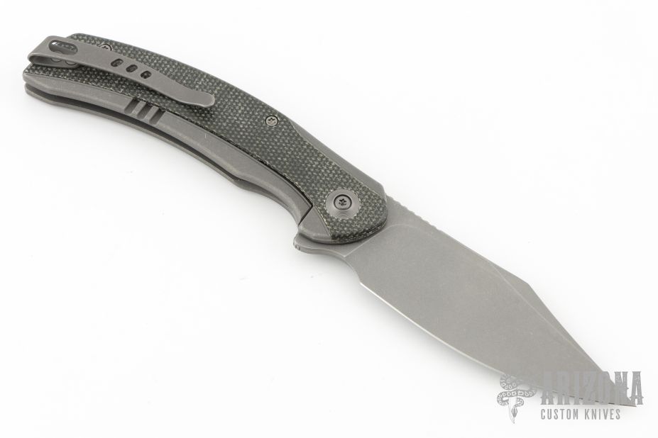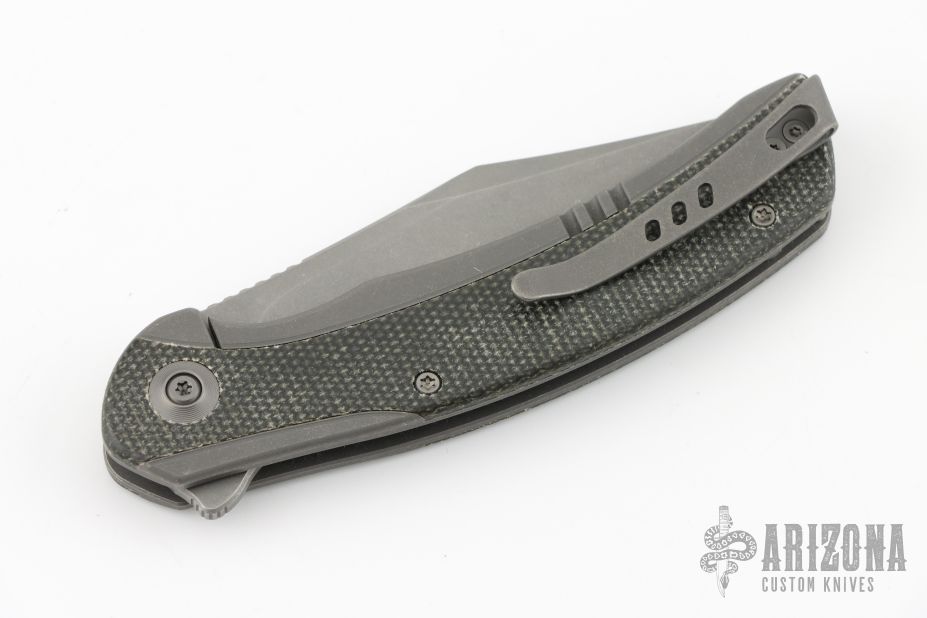 - Stonewashed titanium frame with black canvas micarta scales.