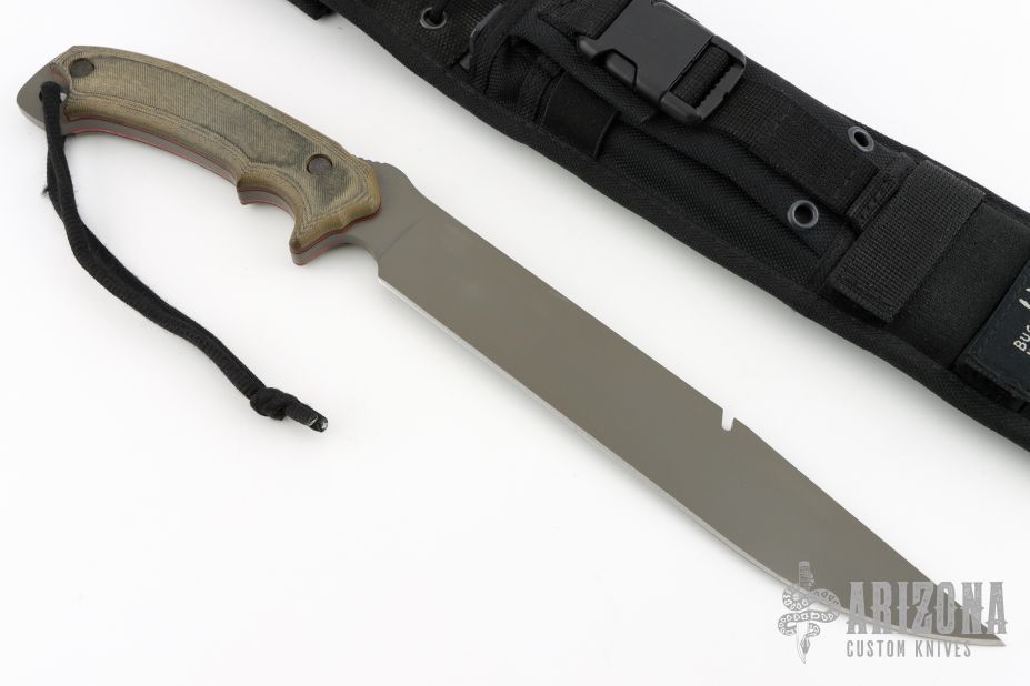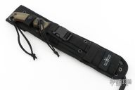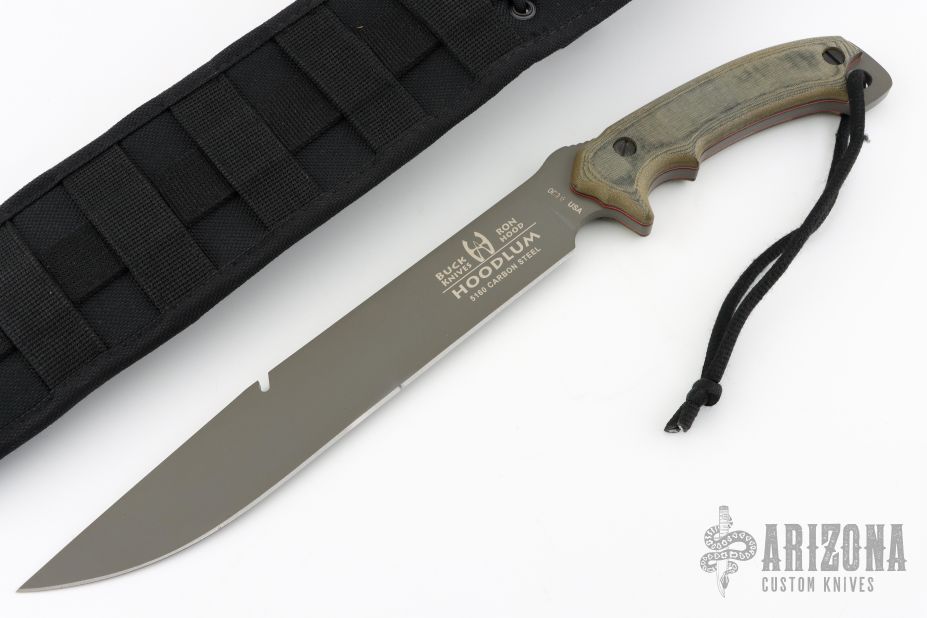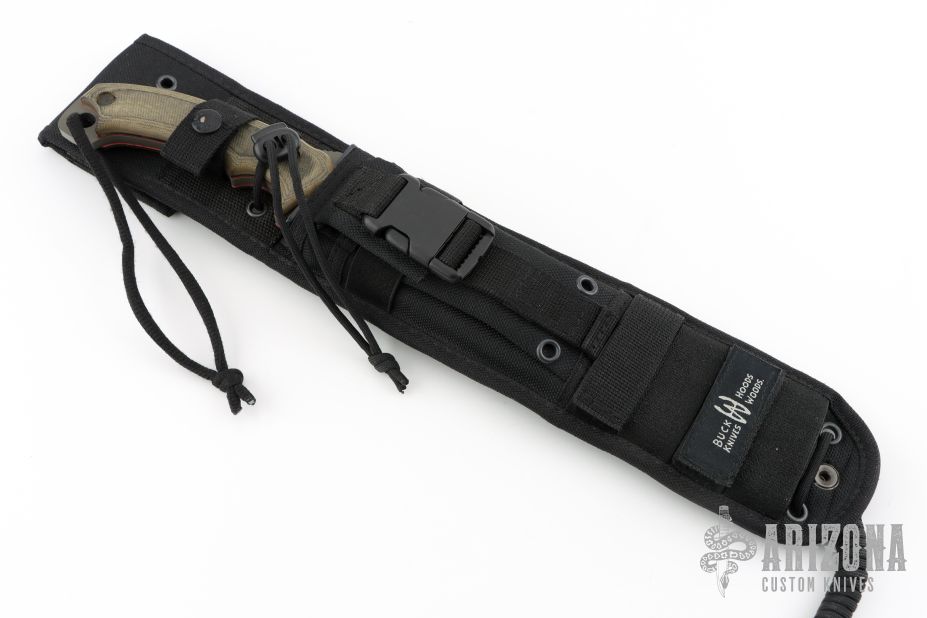 The Hoodlum by Buck is built for ultimate survival. Based on Ron Hood's design and built to Buck's quality standards, the Hoodlum helps ensure survival in extreme conditions. It is light enough to carry in a sheath, but heavy duty enough for any task out in the wilderness. The handle is built with a Shock Mitigation System (SMS) to alleviate shock and wasted energy when chopping. It has a large finger choil for providing control while whittling or other detailed activities. A groove is cut into the blade spine for scoring bone, bending wire, removing pots from a camp fire, or other small tasks. Also, the Micarta handles can be removed to create a spear by lashing a branch to the tang of the blade. There is a cavity under the scales that could be used to store survival items. There is an integrated hammer and lanyard hole in the butt of the handle and it comes with a heavy duty nylon sheath. The Hoodlum will serve all your survival needs from protection to food prep while out in the wilderness. It has a green coated blade with notched thumbrest, .227" blade stock and 1.475" blade depth, full tang construction with black linen micarta scales and red liners. Comes with a black nylon sheath. Excellent Condition.