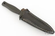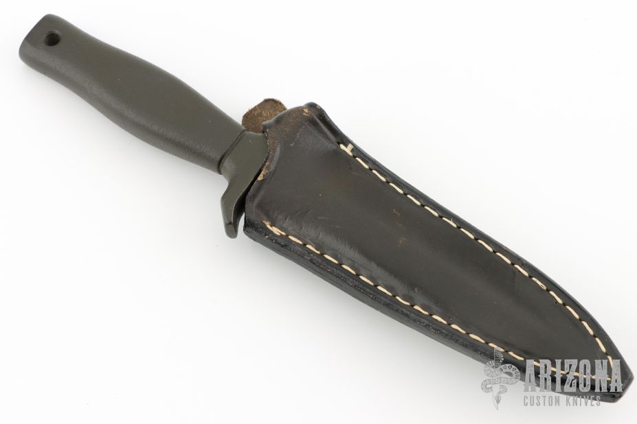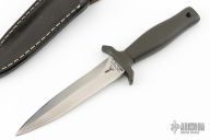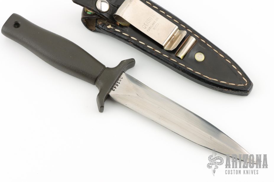 This Mark 1 dagger by Gerber is double-edged and hand rub satin finished, .239" blade stock and .966" blade depth, hidden tang construction. Black coated aluminum handle. Comes with black leather sheath with boot clip. #001643. Has some light scratches, otherwise excellent condition.