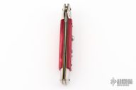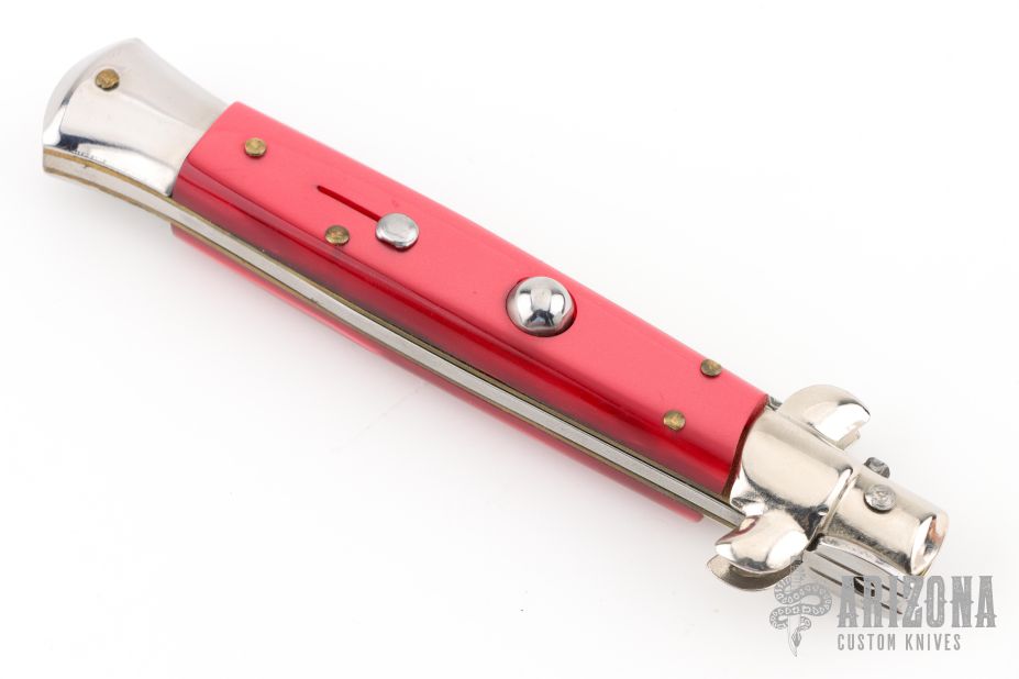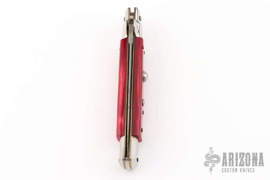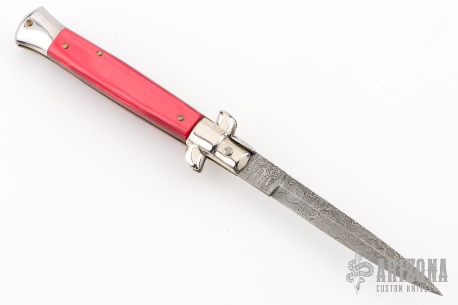 This Swivel Bolster from AB Italy features a Damascus flat ground blade. The handle has nickel silver front bolsters, red scales over brass liners, stainless rear bolsters, and stainless steel backspacer.  Has some light scratches, and patina. Excellent condition.