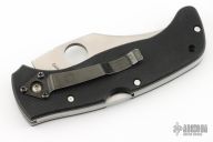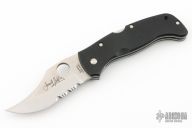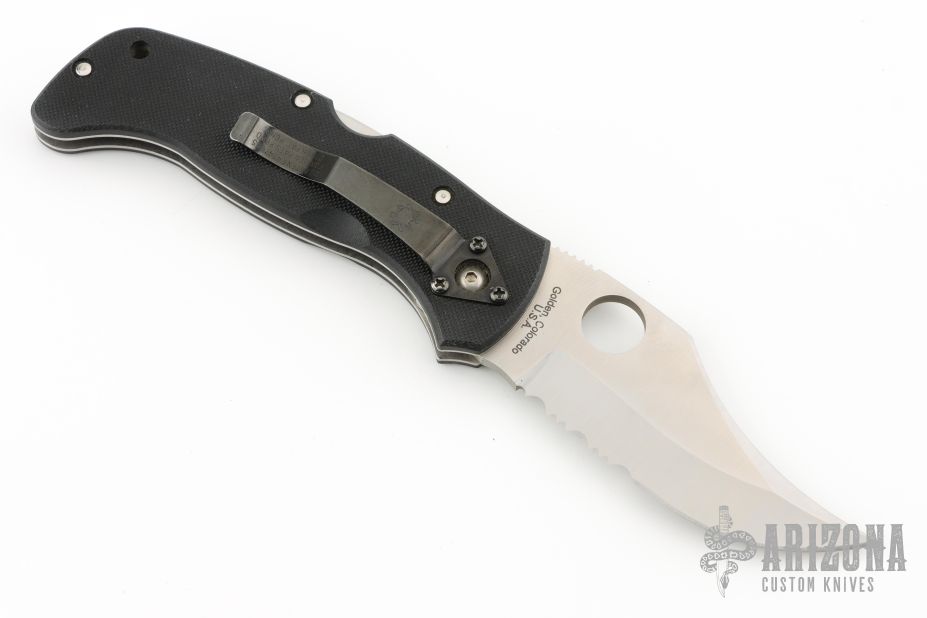 This Generation I Chinook by Spyderco features a satin finish blade with partially serrated edge, notched thumbrest and thumbhole opening. The handle has textured black G10 scales with stainless steel liners and backspacer, 4-way reversible black stainless steel clip. Built like a tank for EDC, survival, and martial arts use. Excellent condition.