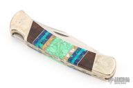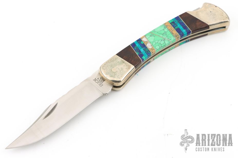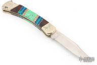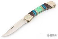 This Buck 110 has been customized by Ken Metsala. It features a satin polished blade with nail nick. The handle features nickel silver bolsters and mosaic overlay with stainless liners and stainless steel spring. Blade spine and rockerbar have been file worked. Has some light scuffs, excellent condition otherwise.
