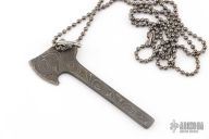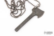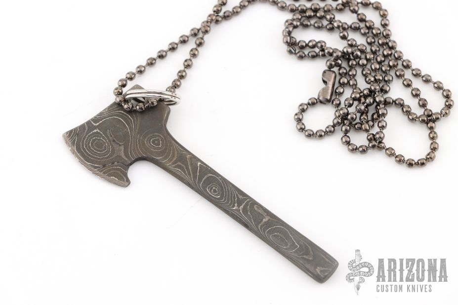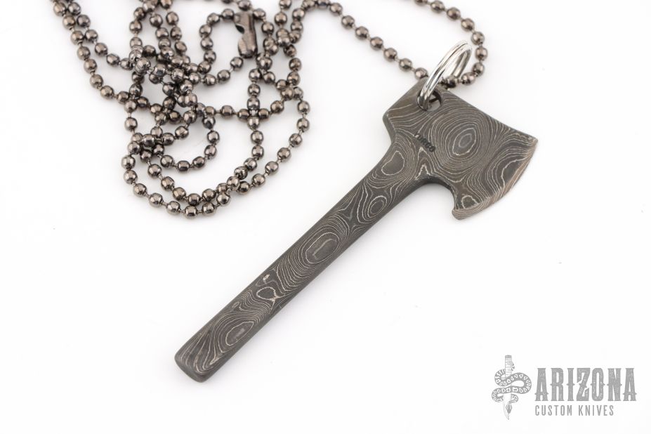 This Damascus Hatchet Pendant by Mickey Yurco is made from .118" thick Damascus with a split ring and ball chain. Excellent condition.