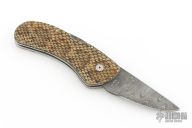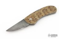 This Lockback folder by Michael Tamboli features a Damascus blade. The handle has snake skin covers, stainless steel liners and a Damascus backstrap and rockerbar. Nice lockup and blade. Has some scratches and patina, great condition otherwise.