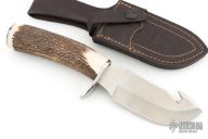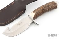 This hunter by Joker features a satin finish blade with .138" blade stock, 1.635" blade depth, hidden tang construction. The handle has stainless steel guard and butt with stag grip. Comes with a brown leather sheath. Has some light scratches, otherwise excellent condition.
