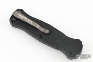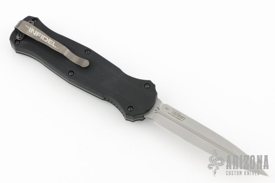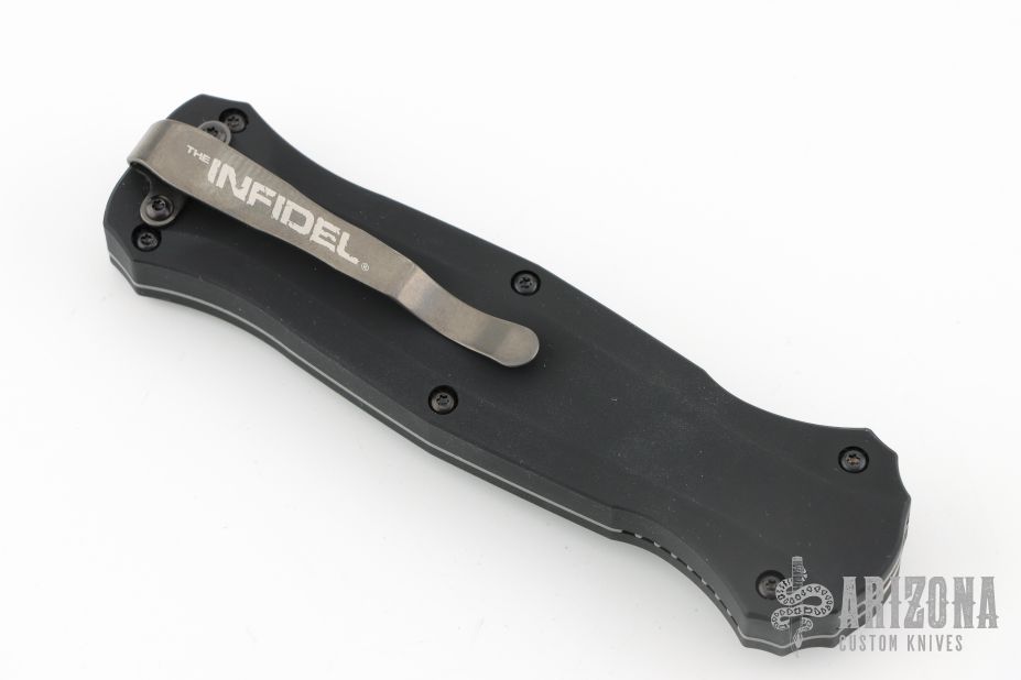 "Introducing an OTF like none-other.. The new Infidel® is rapidly making believers out of many a skeptic. Built for strength and reliability the patent pending double-action mechanics get it done over the long haul. Grab on and you will find the handle grip rock-solid with its patented machined in Presidio® style bi-directional tread pattern, and overall generous sizing for gloved hands. Intuitively pressure the release-slide forward and its spear-point edged steel fires and locks up with a unique three-point retention system with amazingly negligible blade play. Reverse the process and the blade retracts in a rapid blur of motion. The Benchmade Infidel is a special operator’s fantasy come true." Comes with original box and belt sheath. Excellent condition.