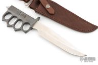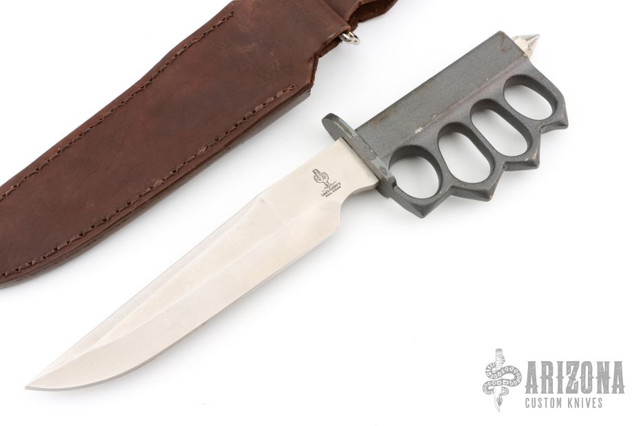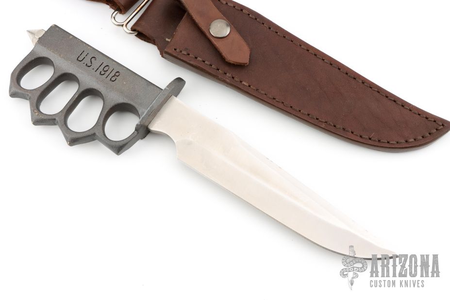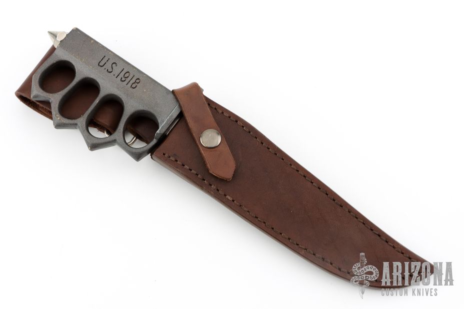 This 1918 Trench Knife reproduction handle has been re-bladed by Lee's Cutlery. It has a satin finished clip point blade with false top edge, .191" blade stock , 1.51" blade depth, hidden tang construction. The handle has cast knuckles with tang nut holding the blade in place. Comes with leather dangler sheath. Has some scuffs and chips in the handle. Overall great shape.