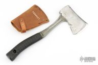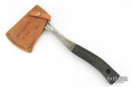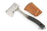 This Axe by Bridgeport Manufacturing Corp. features .371" blade stock and 3.125" blade depth, full tang construction. The handle has rubber coated scales. Comes with leather heath. Has some patina and scratches, great condition for its age.