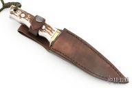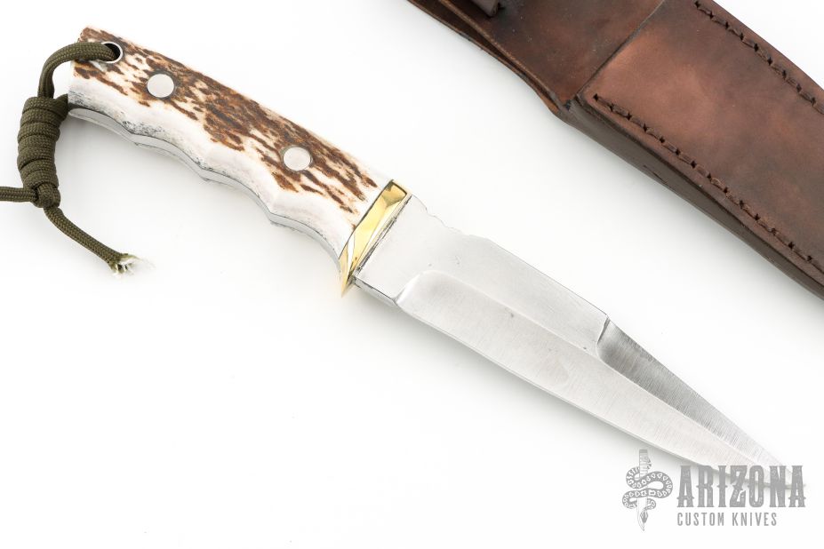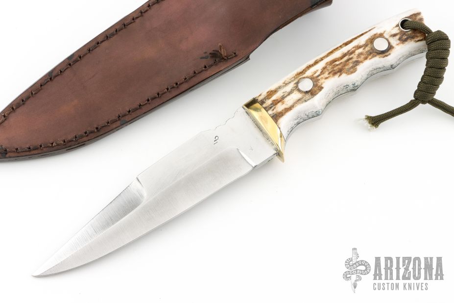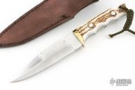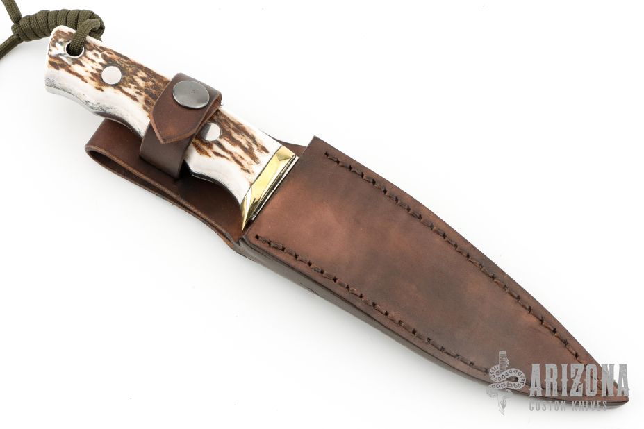 This fixed blade (please let us know if you recognize this maker) features a satin finished clip point blade with top edge, thumb rest, .2" blade stock and 1.327" blade depth, full tang construction with stag scales and aluminum pins. Comes with a leather sheath. Has some scratches, great condition otherwise.