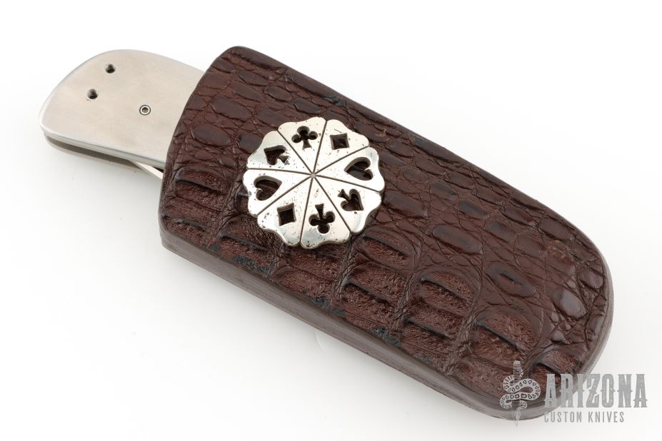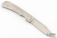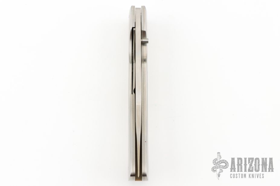 This linerlock features a satin finished blade with a single thumbstud. The handle has steel covers, stainless steel liners and tan G10 backspacer. Has holes for tip up and tip down clip. No clip attached or included. Comes with a very nice leather belt sheath. Nice detent, blade seating and lockup. Has some light scratches, great condition otherwise.