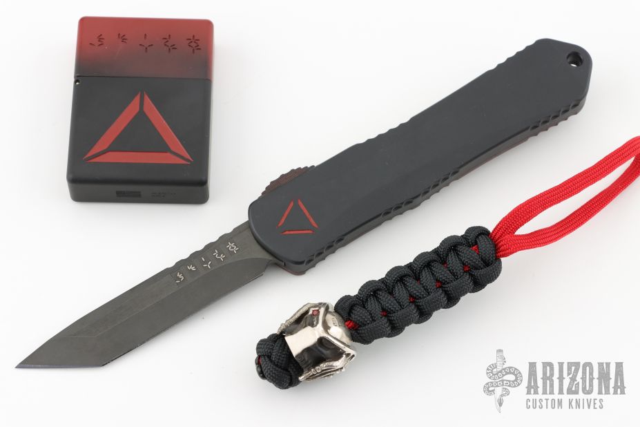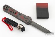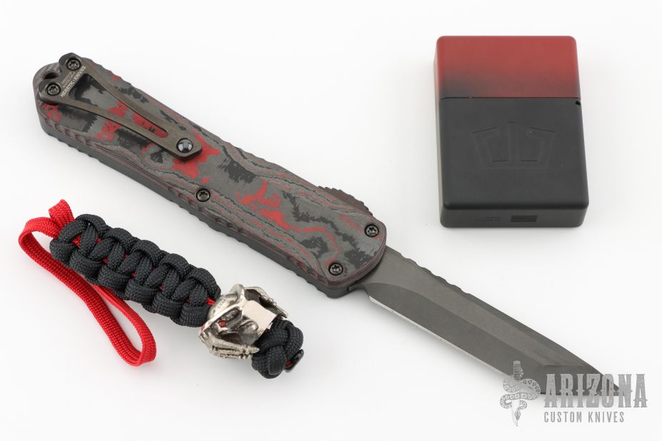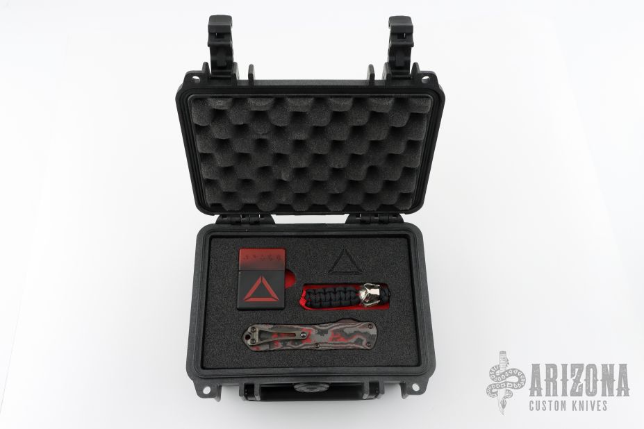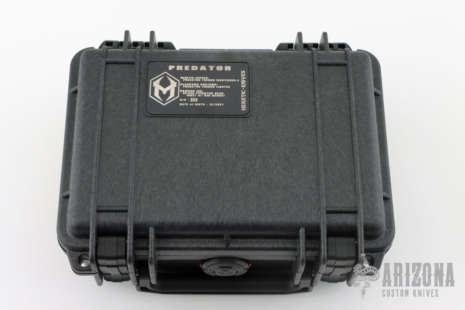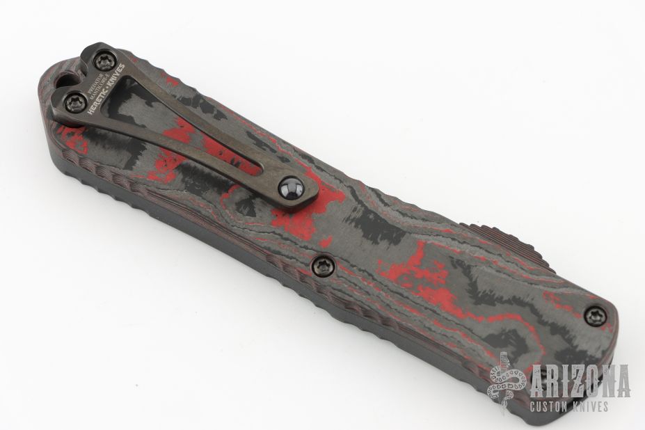 This Predator Manticore-E Set by Heretic Knives and Blackside Customs features a Battleworn two-tone DLC tanto blade. The handle has a Red Camo carbon fiber and black aluminum frame with DLC hardware and a Battleworn DLC tip down titanium clip with ceramic ball inlay, checkered carbon fiber thumb slide, very grippy. Comes with original 1120 Pelican case and box. COA is a plaque on the case. S/N 059 Dated 12/21. Excellent condition.