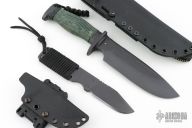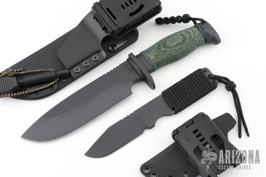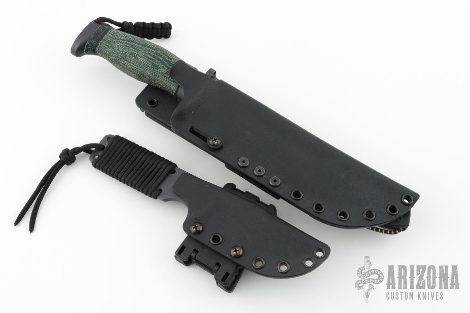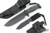 It comes with a "Hog" as a companion blade. It has a black asymetrically ground blade with swedge and notched thumbrest, .209" blade stock and 1.193" blade depth, full tang construction with cord wrapped grip. Comes with a kydex sheath. D2 Blade steel. Excellent condition.