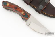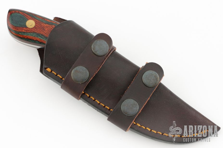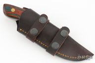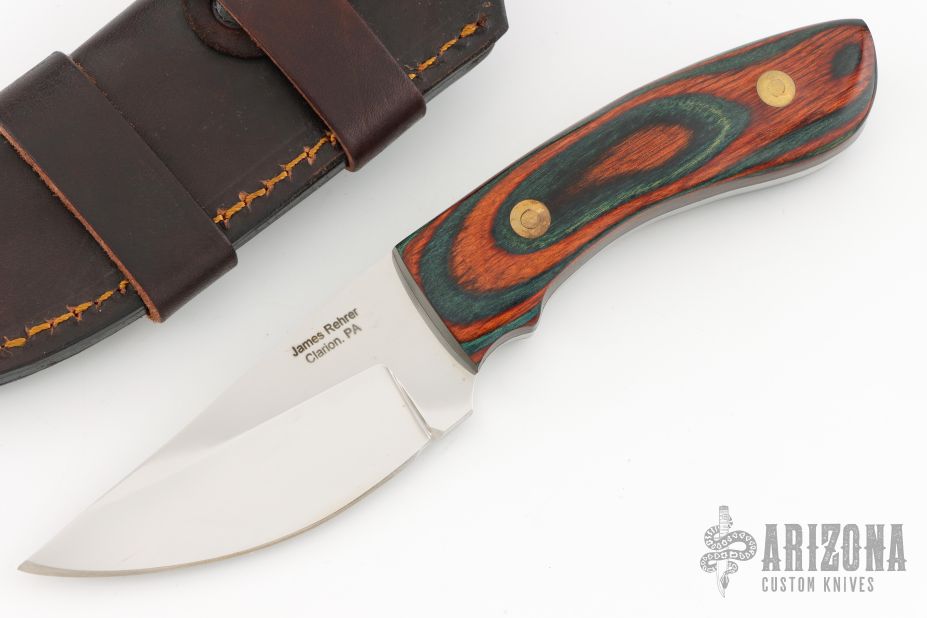 This knife by James Rehrer features a mirror polished blade with .161" blade stock and 1.366" blade depth, full tang construction. The handle has dymondwood scales. Comes with a brown leather boot sheath. Excellent condition.