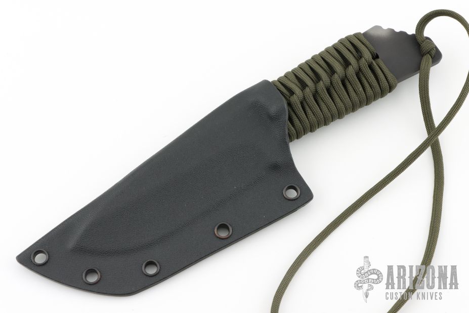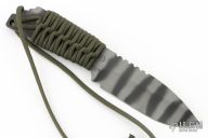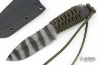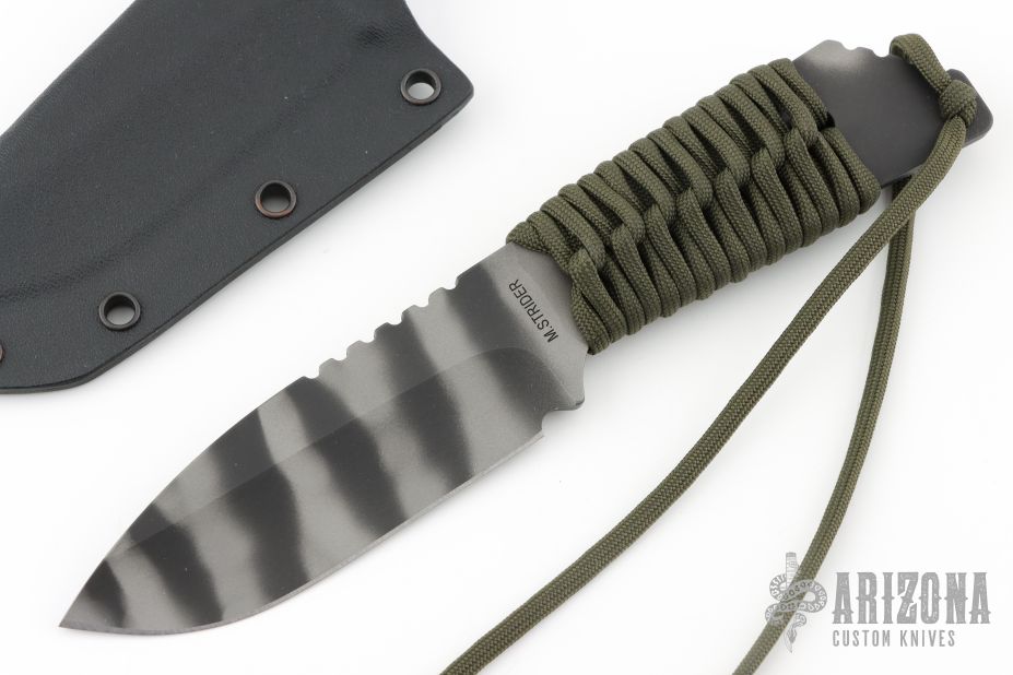 This knife by Mick Strider features a tiger striped drop point blade with a notched thumbrest, .207" blade stock and 1.380" blade depth, full tang construction. The handle has a cord-wrapped grip. Comes with a kydex sheath. New condition.