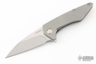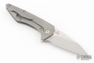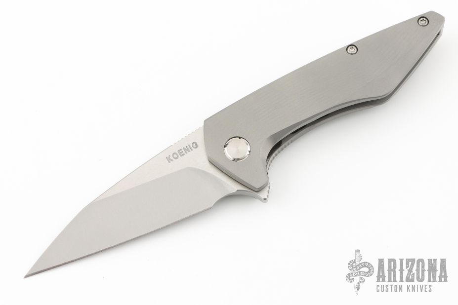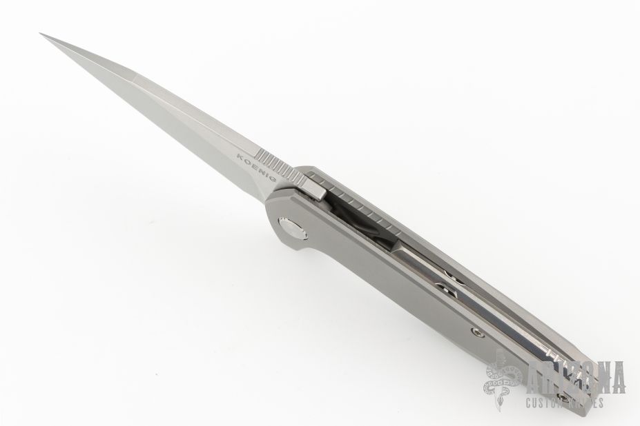 The Koenig Mini-Goblin 3 inch folding pocket knife is a collaboration between Edison Barajas of Sharknivco and Koenig Knives. The Mini-Goblin features a 3 inch burnished w/ PF blade with notched thumbrest and flipper. The handle has a bead blasted sea pattern titanium frame with a stonewashed titanium backspacer and raw titanium pivot/hardware. Titanium tip up clip with hidden screws. Comes with original box and card dated April 16, 2025. New condition.