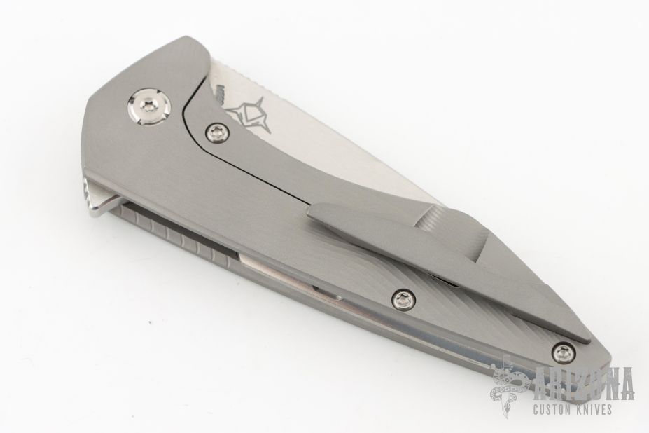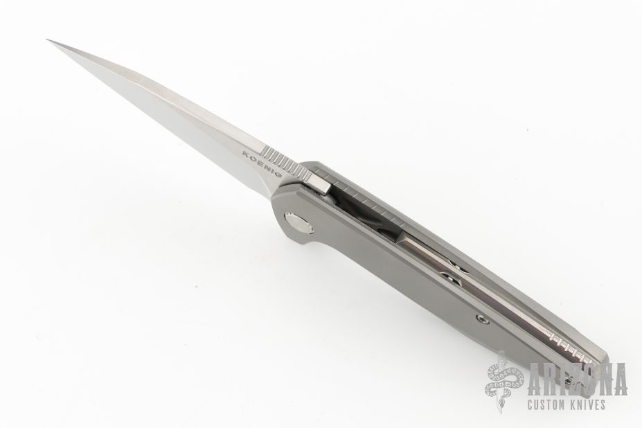 The Koenig Mini-Goblin 3 inch folding pocket knife is a collaboration between Edison Barajas of Sharknivco and Koenig Knives. The Mini-Goblin features a 3 inch brightwashed w/ PF blade with notched thumbrest and flipper. The handle has a bead blasted sea pattern titanium frame with a stonewashed titanium backspacer and raw titanium pivot/hardware. Titanium tip up clip with hidden screws. Comes with original box and card dated April 3, 2025. New condition.