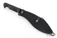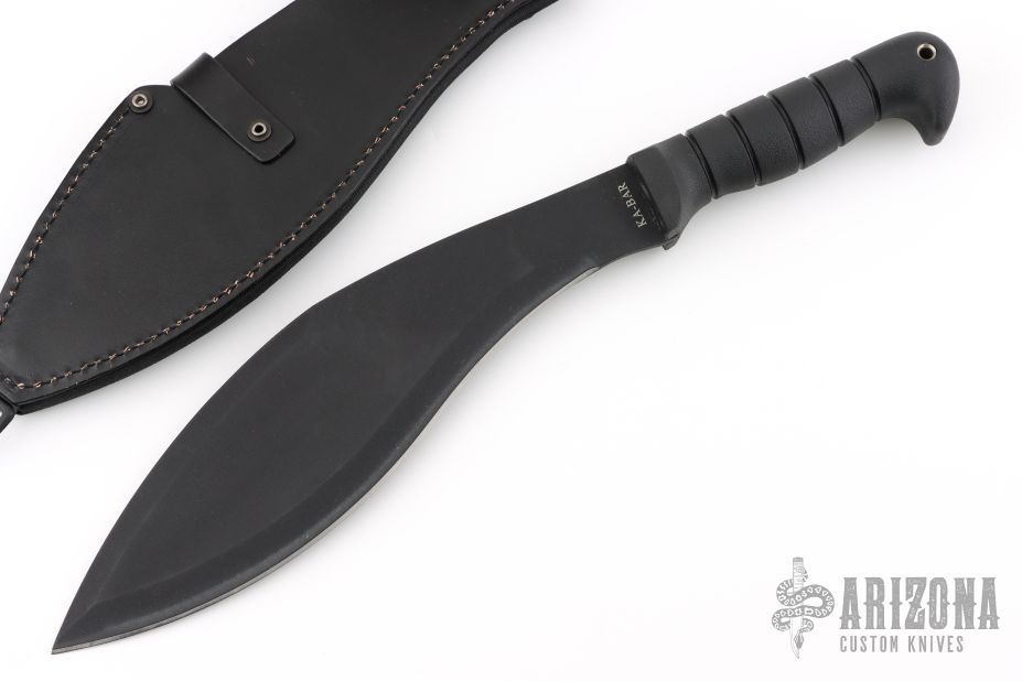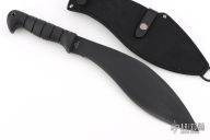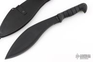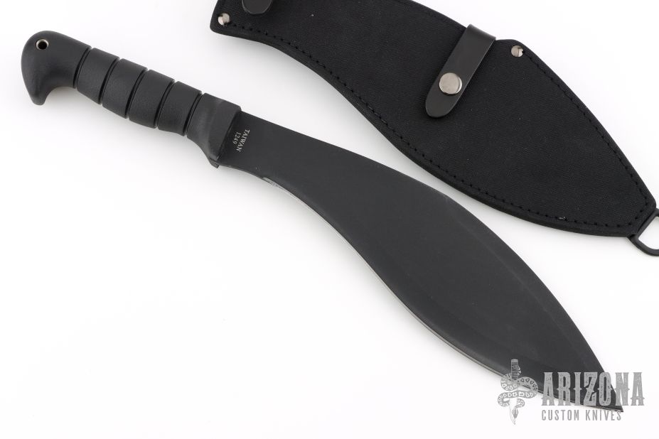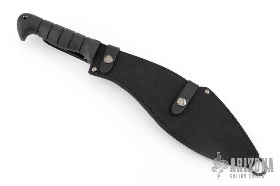 This Kukri Machete by Ka-Bar features a black kukri style blade with false top edge, .161" blade stock and 2.957" blade depth, hidden tang construction. The handle is black TPR with lanyard hole at the butt. Comes with a black leather and nylon sheath. Has a couple light scuffs, otherwise excellent condition.