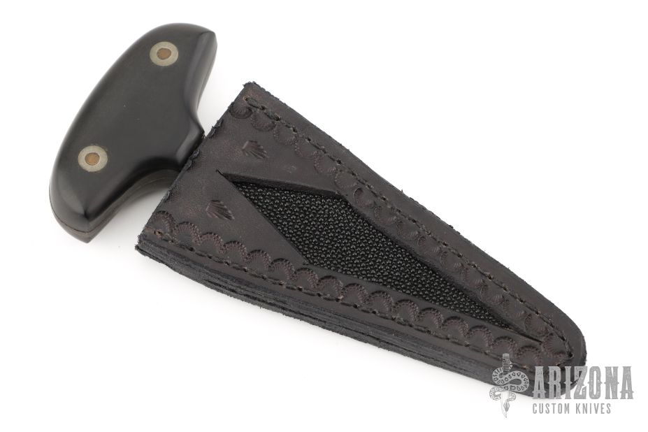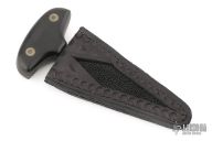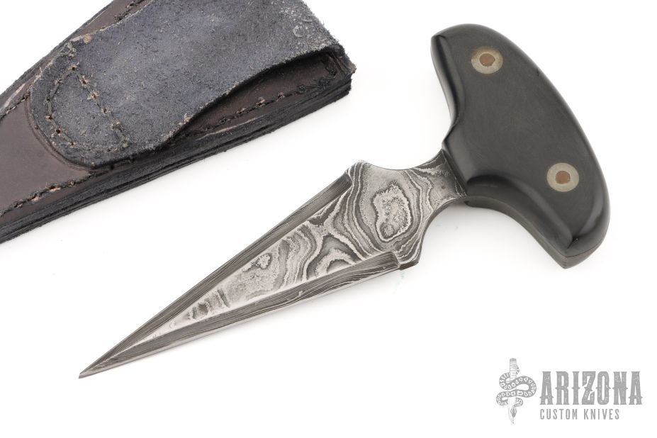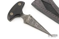 This push dagger by Mike Carter features a double edged Damascus blade with .117" blade stock and 1.240" blade depth, full tang construction. The handle has a paper micarta grip with Corby bolts. Comes with a leather belt sheath.