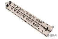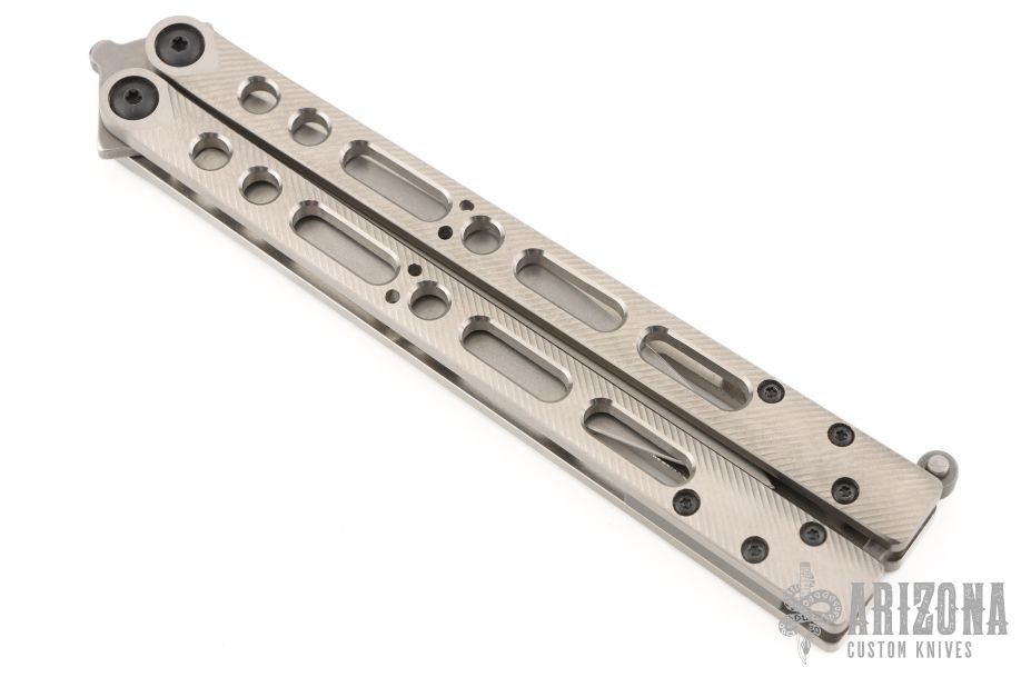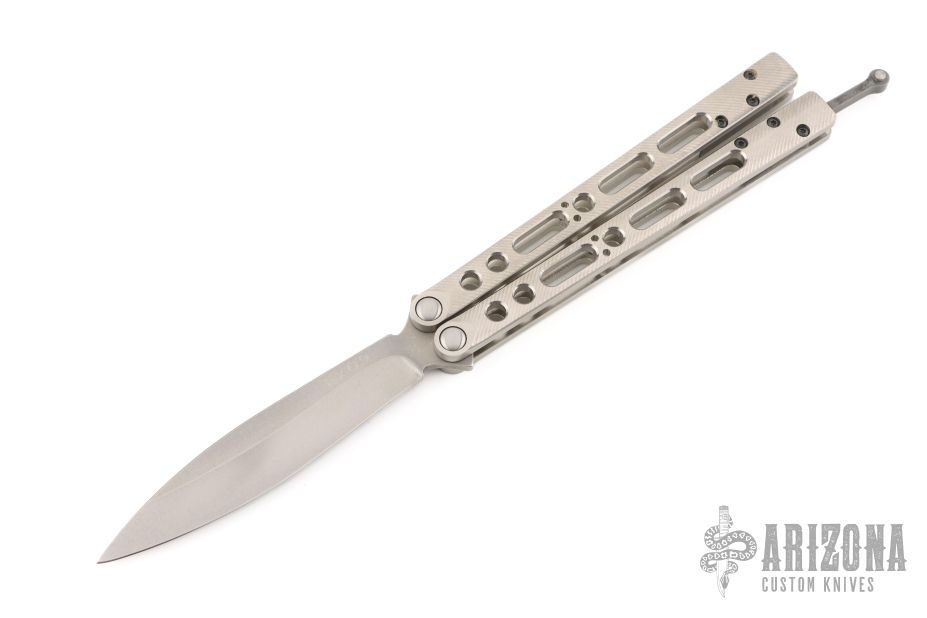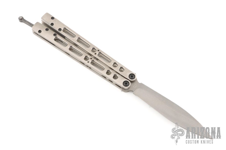 This Ex9 Balisong by Geof Dumas features a bead blast finished drop point blade. The handles are milled titanium with black hardware, darkened matching spacers, and T-latch. Very smooth flipping. Excellent condition. First run number thirty one of thirty two made. Very Rare.
