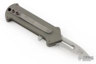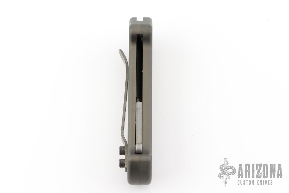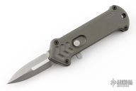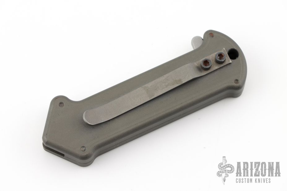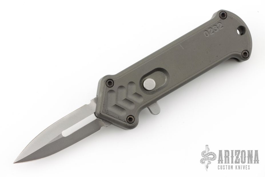 This Cupid by Rob Dalton is an OTF automatic and features a double-edged bead blasted chisel ground blade and milled aluminum handle. Bead blast titanium clip. Fires via push button and retracts by holding the button and moving the slider on the side of the knife. Fires hard, has some light scuffs, otherwise excellent condition.