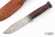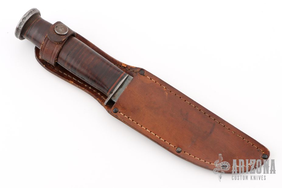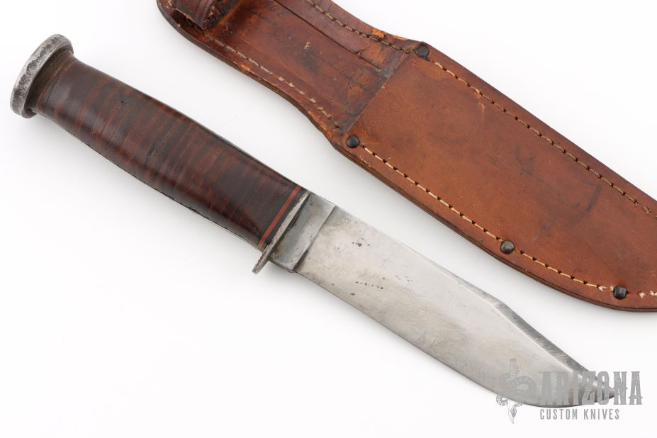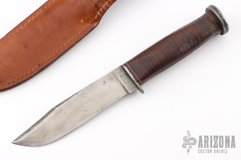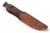 This WWII era fighter by Western Cutlery features a satin finished blade with false to edge, .121" blade stock and 1.178" blade depth, full tang construction. The handle has a steel guard, stacked leather scales with black and red spacers and a steel butt with peened tang. Comes with a brown leather sheath. Blade stamped "WESTERN Boulder Colo. PAT. NO. 1.967.479". Has scratches and patina, has been resharpened, otherwise good condition for its age. The sheath has this hand written on the belt loop "R.G.E. Langemak Bay New Guinea March 1944"