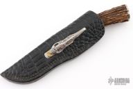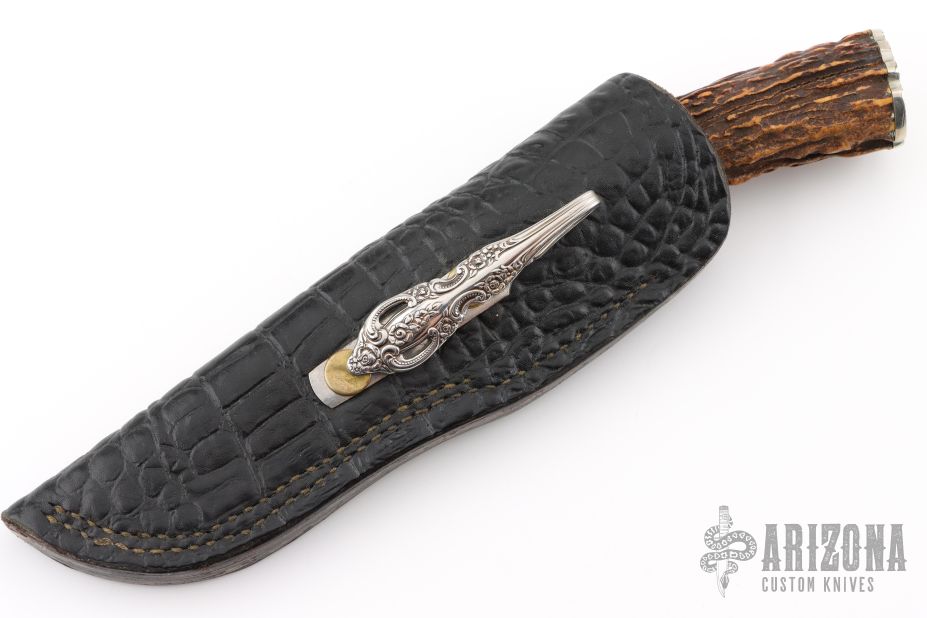 This Hunter by Jeff Murison features a Cable Damascus blade with fileworked spine, .211" blade stock and .913" blade depth, hidden tang construction. The handle has a nickel silver guard with fileworked spacer, stag grip, nickel silver butt plate. Comes with a gator patterned black leather sheath with silverware handle clip. Excellent condition.