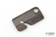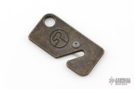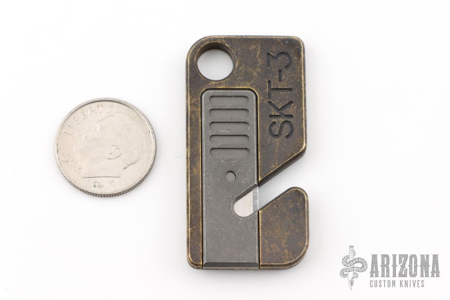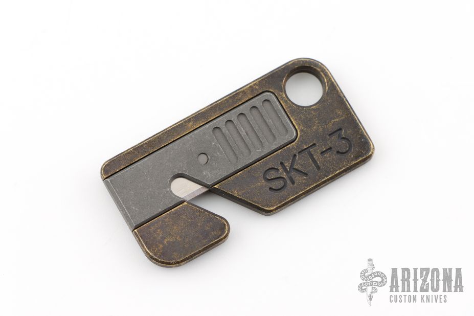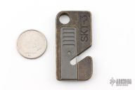 This SKT-3 by Serge Panchenko features a razor style blade. The handle has an antiqued brass frame with titanium covering. Comes with bag and card. Has patina, excellent condition.